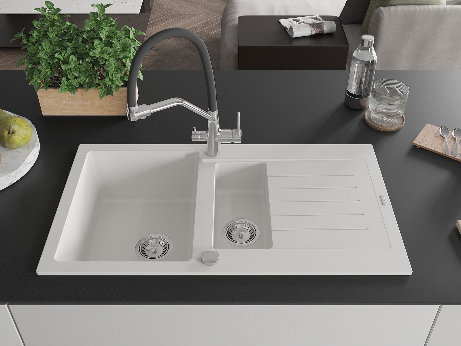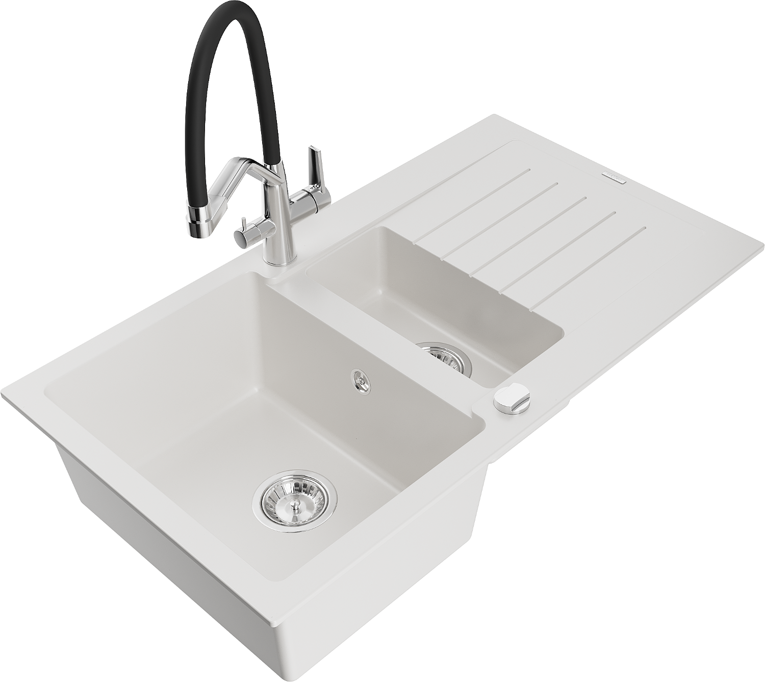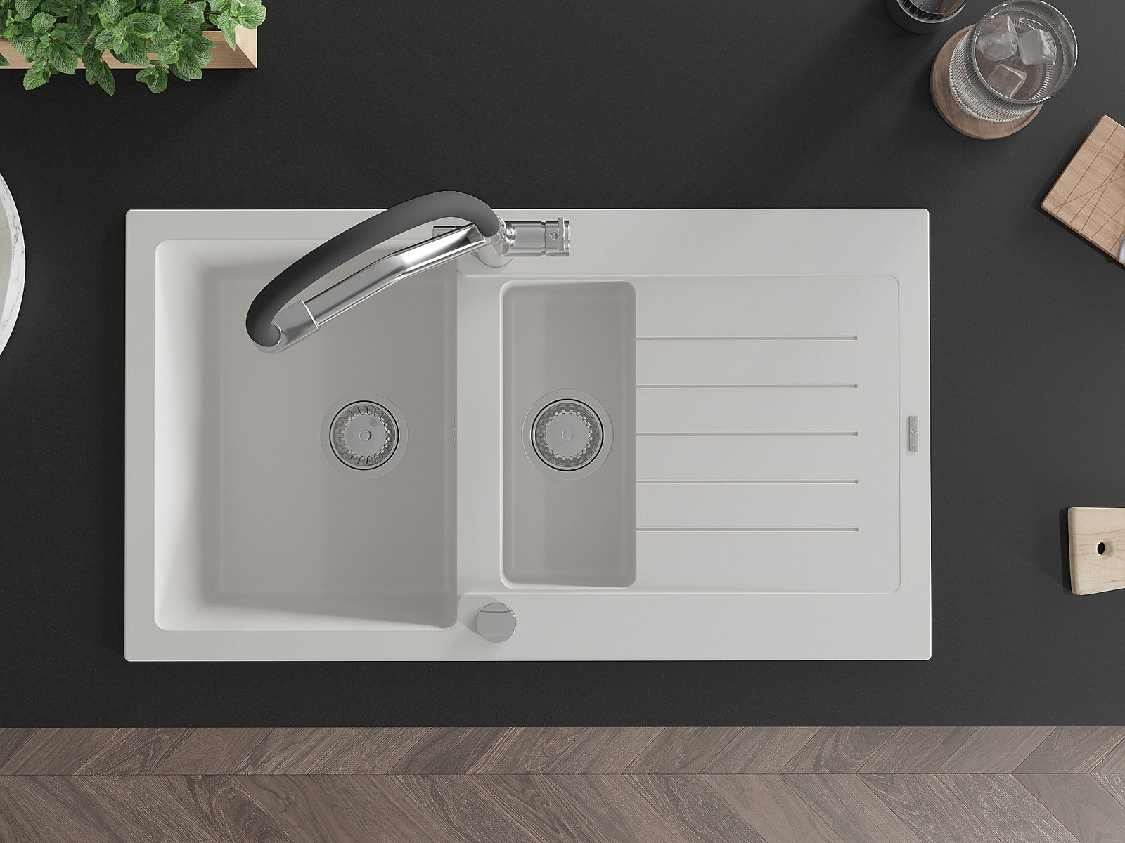 Mexen Matias zlewozmywak granitowy 1,5-komorowy z ociekaczem i baterią kuchenną Duo, biały - 6502-20-671701-07