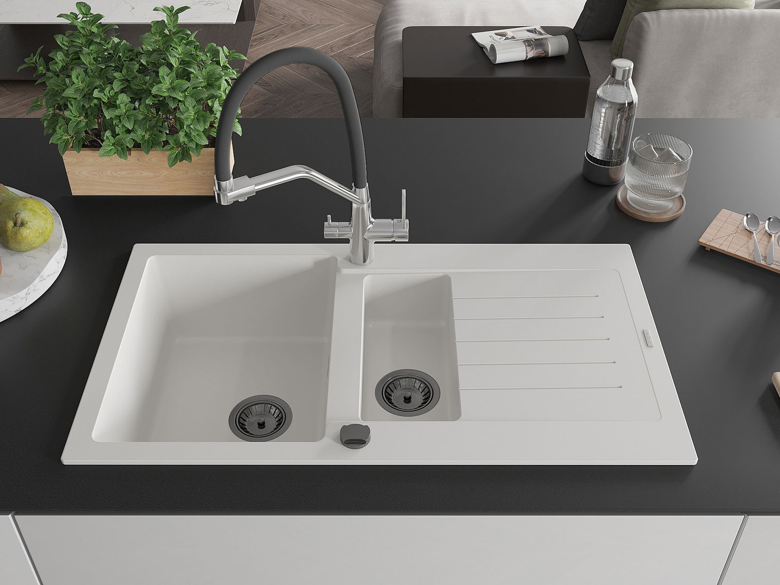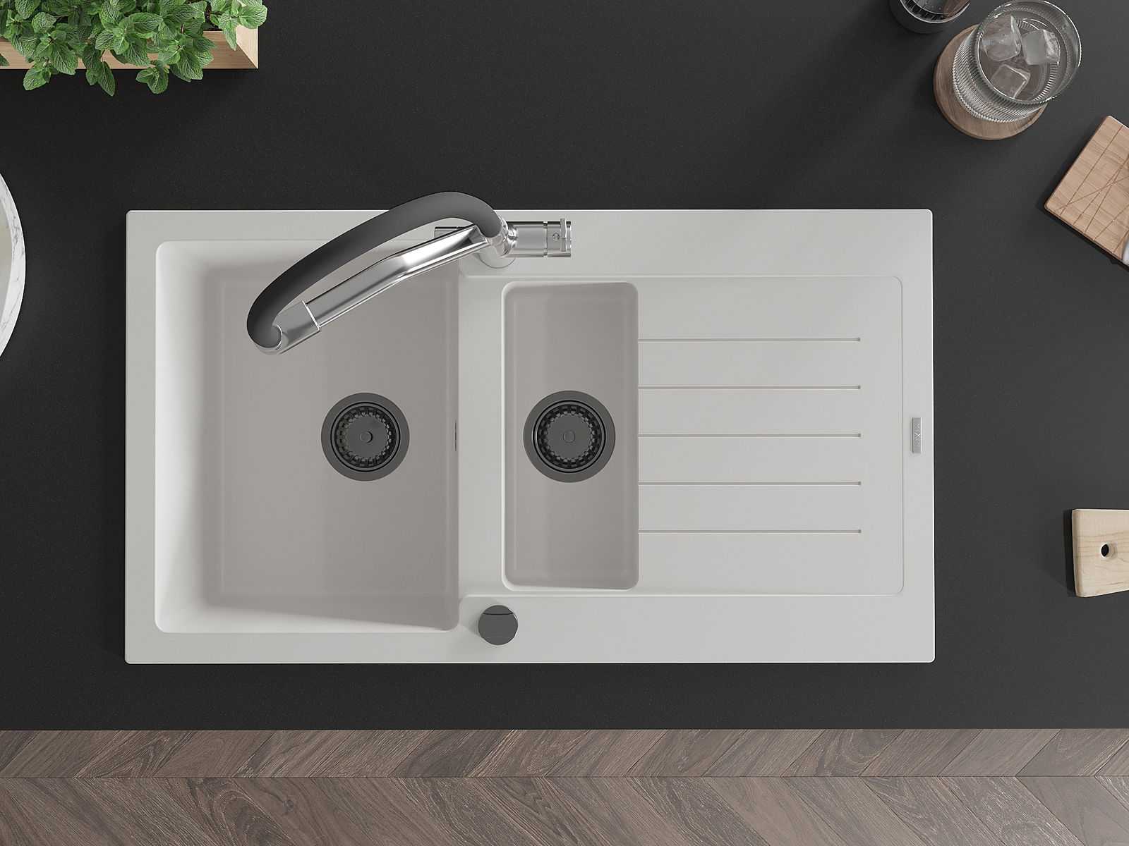 Mexen Matias zlewozmywak granitowy 1,5-komorowy z ociekaczem i baterią kuchenną Duo, biały - 6502-20-671701-07-B