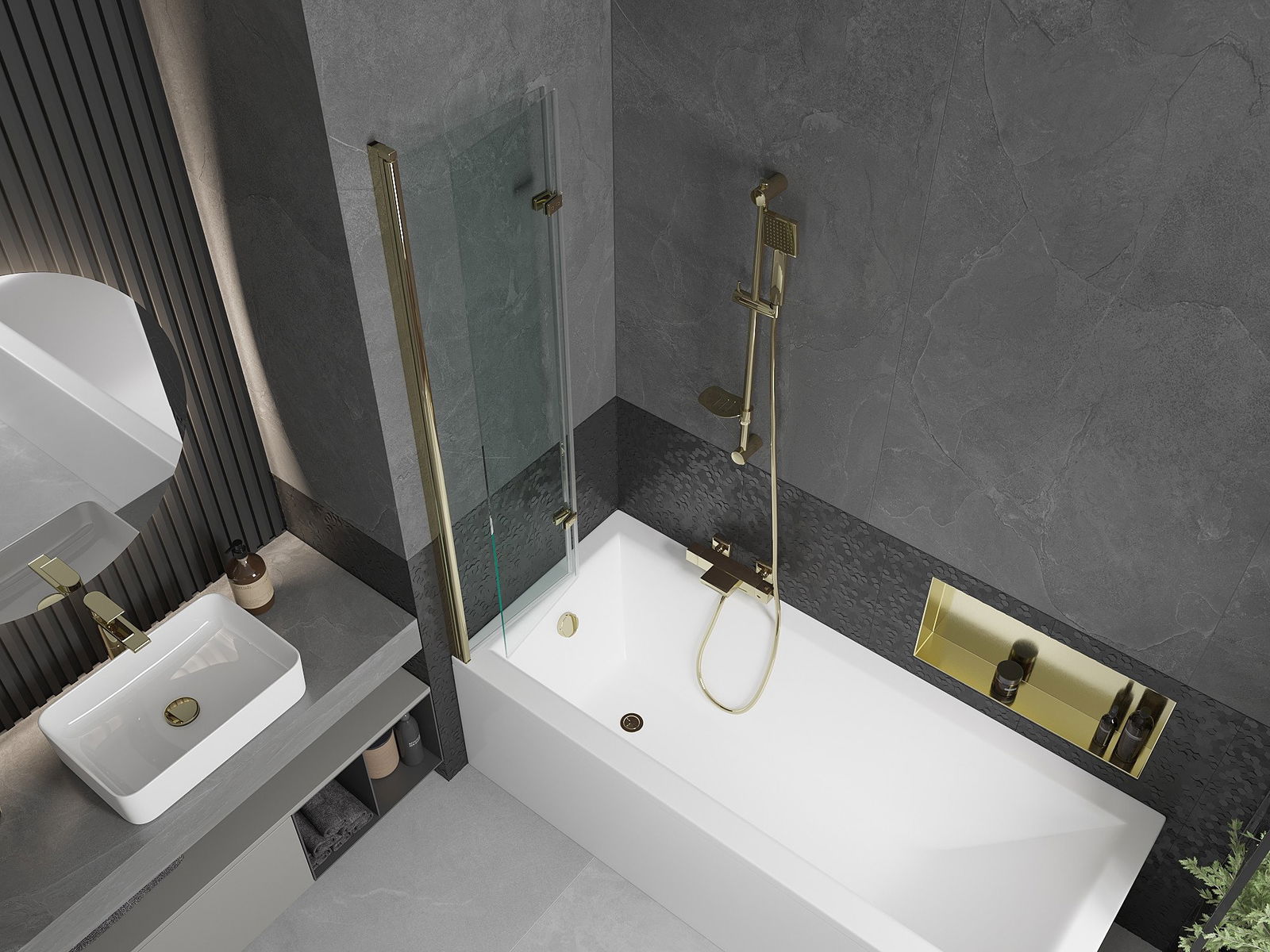 Parawan wykonany z dwóch skrzydeł z możliwością złożenia. Takie rozwiązanie pozwala zaoszczędzić więcej miejsca w łazience i umożliwia swobodne korzystanie z pozostałej przestrzeni, gdy nie korzystamy ze strefy kąpielowej.