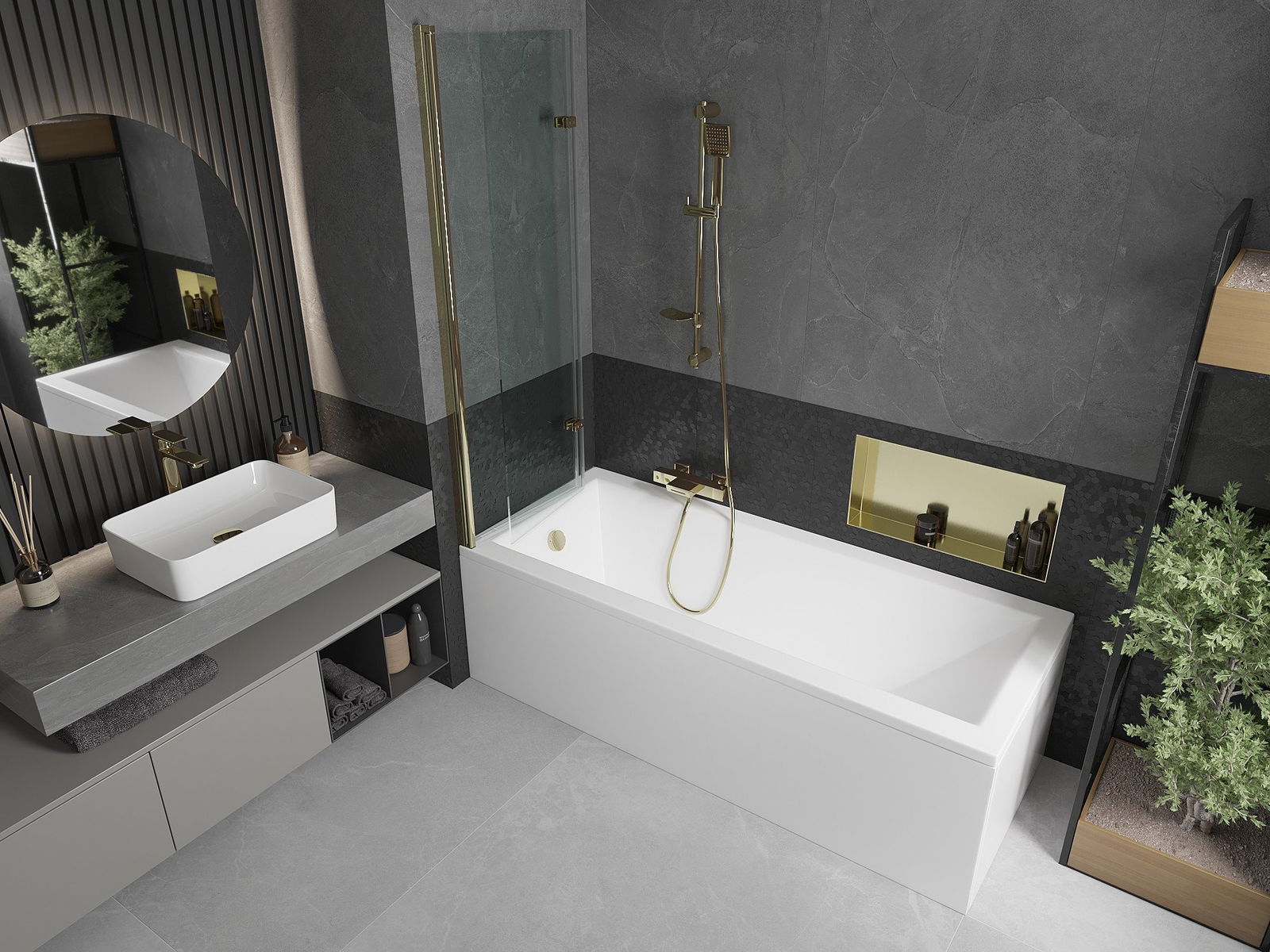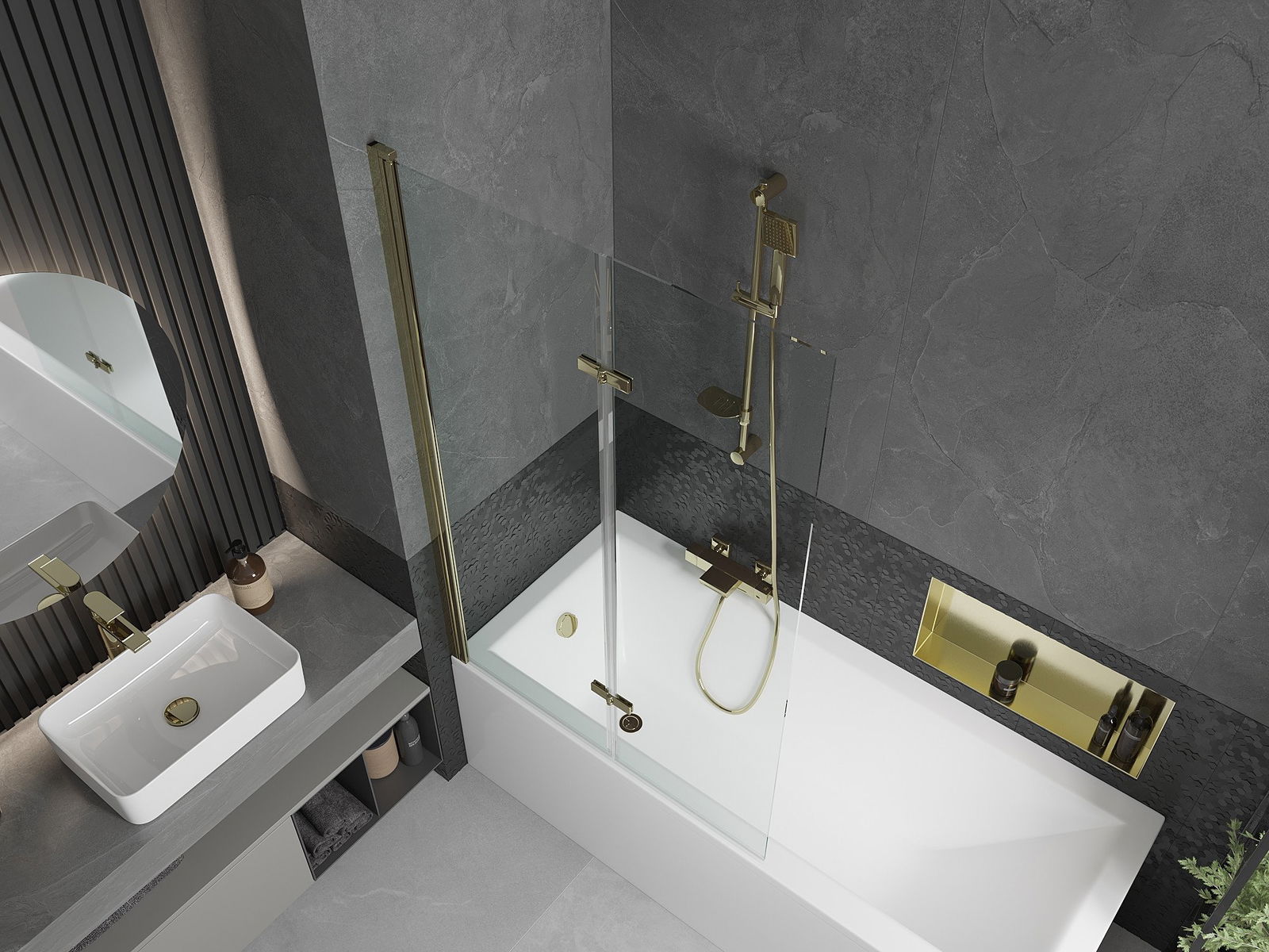 Parawan wykonany z dwóch skrzydeł z możliwością złożenia. Takie rozwiązanie pozwala zaoszczędzić więcej miejsca w łazience i umożliwia swobodne korzystanie z pozostałej przestrzeni, gdy nie korzystamy ze strefy kąpielowej.