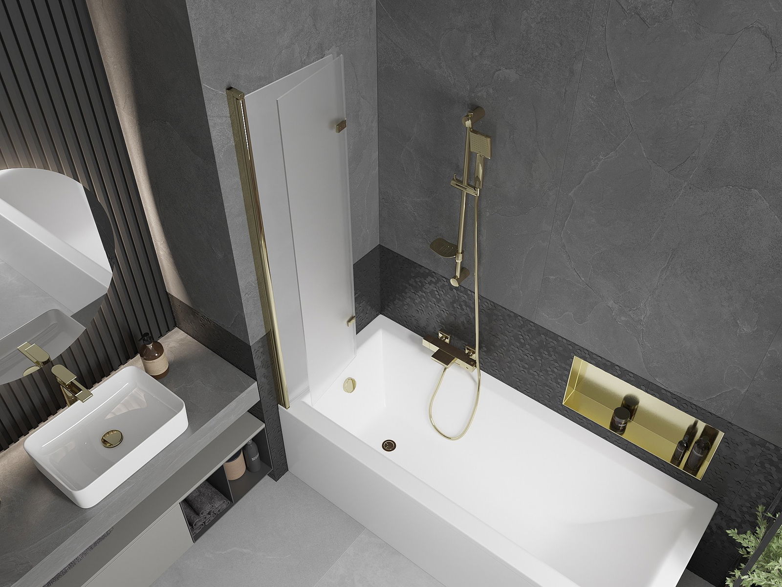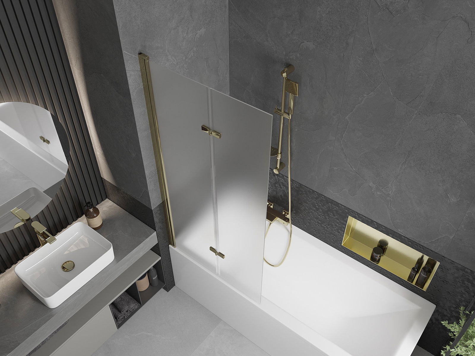 Parawan wykonany z dwóch skrzydeł z możliwością złożenia. Takie rozwiązanie pozwala zaoszczędzić więcej miejsca w łazience i umożliwia swobodne korzystanie z pozostałej przestrzeni, gdy nie korzystamy ze strefy kąpielowej.