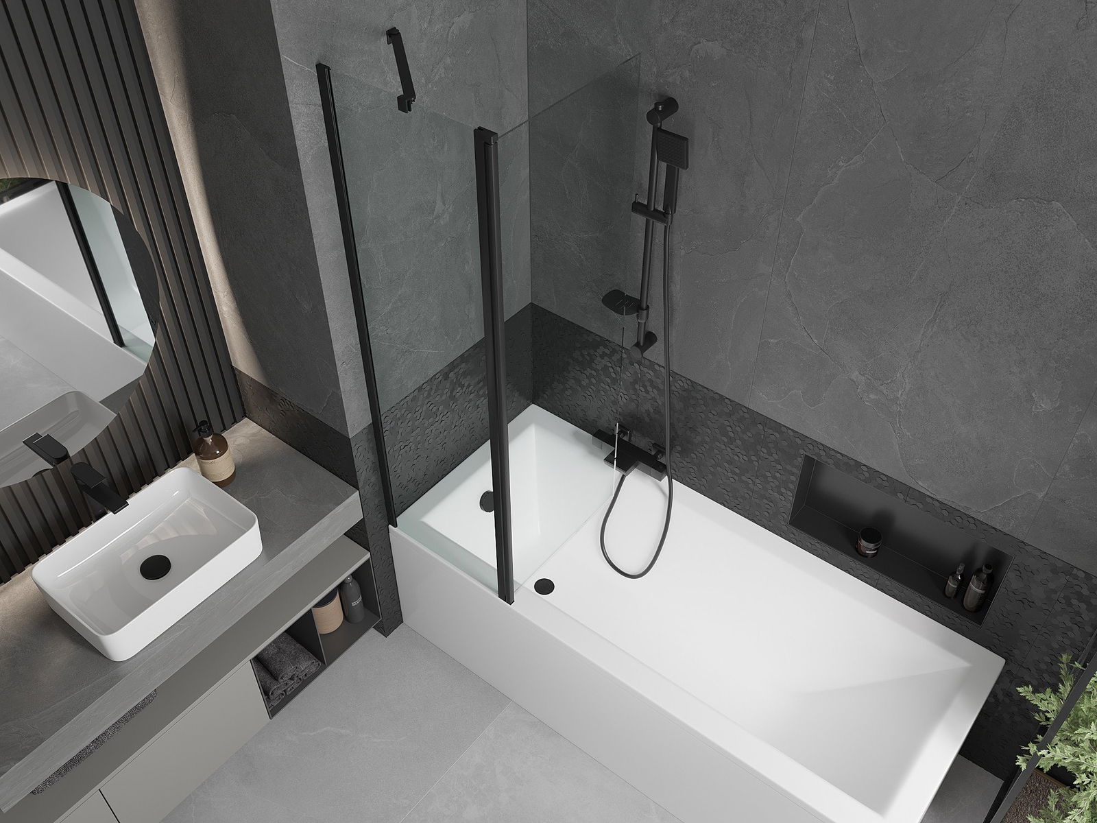 Parawan posiada jedno ruchome skrzydło z możliwością złożenia. Takie rozwiązanie pozwala zaoszczędzić więcej miejsca w łazience i umożliwia swobodne korzystanie z pozostałej przestrzeni, gdy nie korzystamy ze strefy kąpielowej.