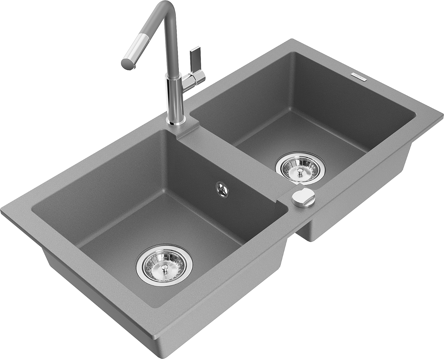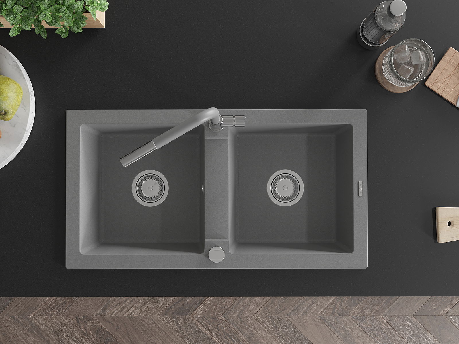 Mexen Mario zlewozmywak granitowy 2-komorowy z baterią kuchenną Flora, szary - 6504-71-670401-06