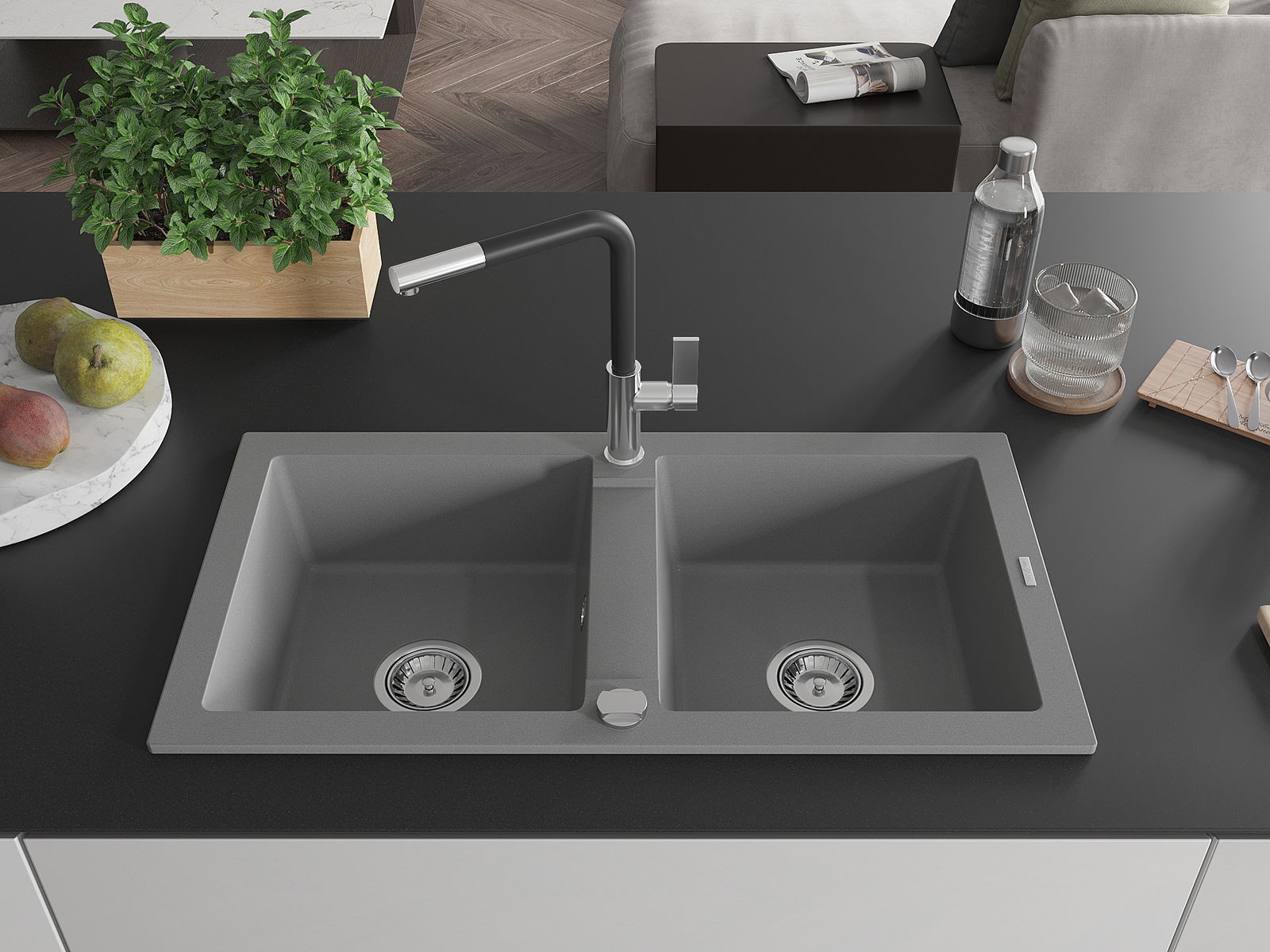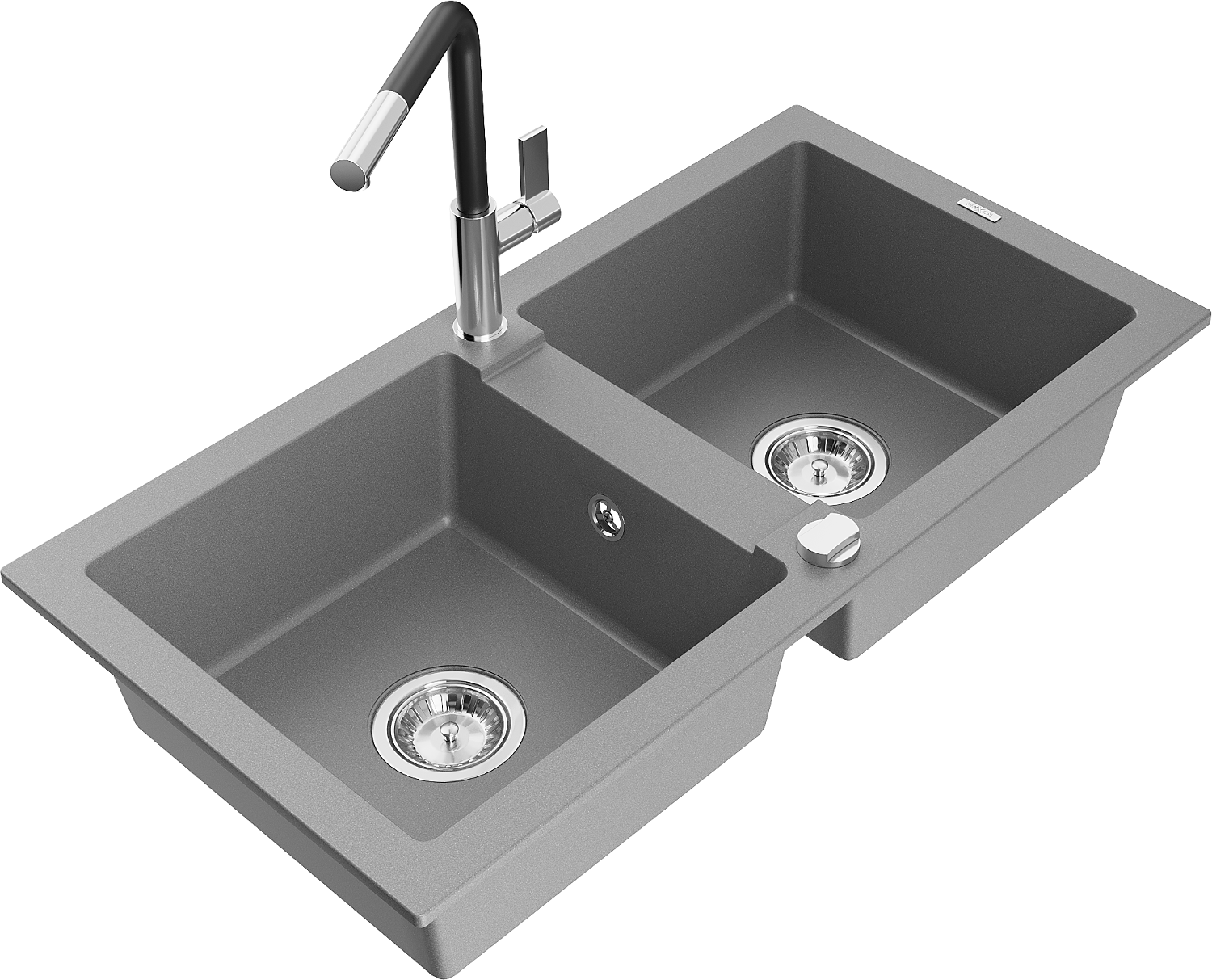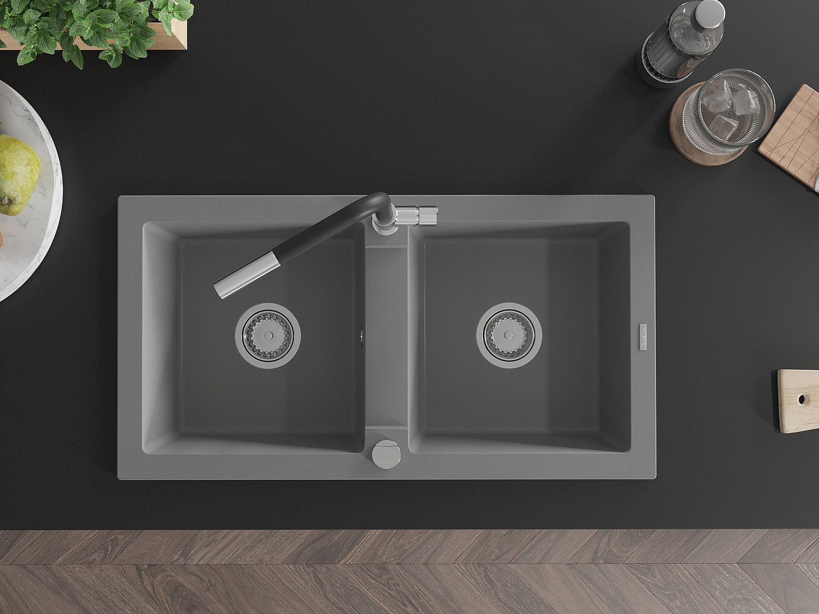 Mexen Mario zlewozmywak granitowy 2-komorowy z baterią kuchenną Flora, szary - 6504-71-670401-07