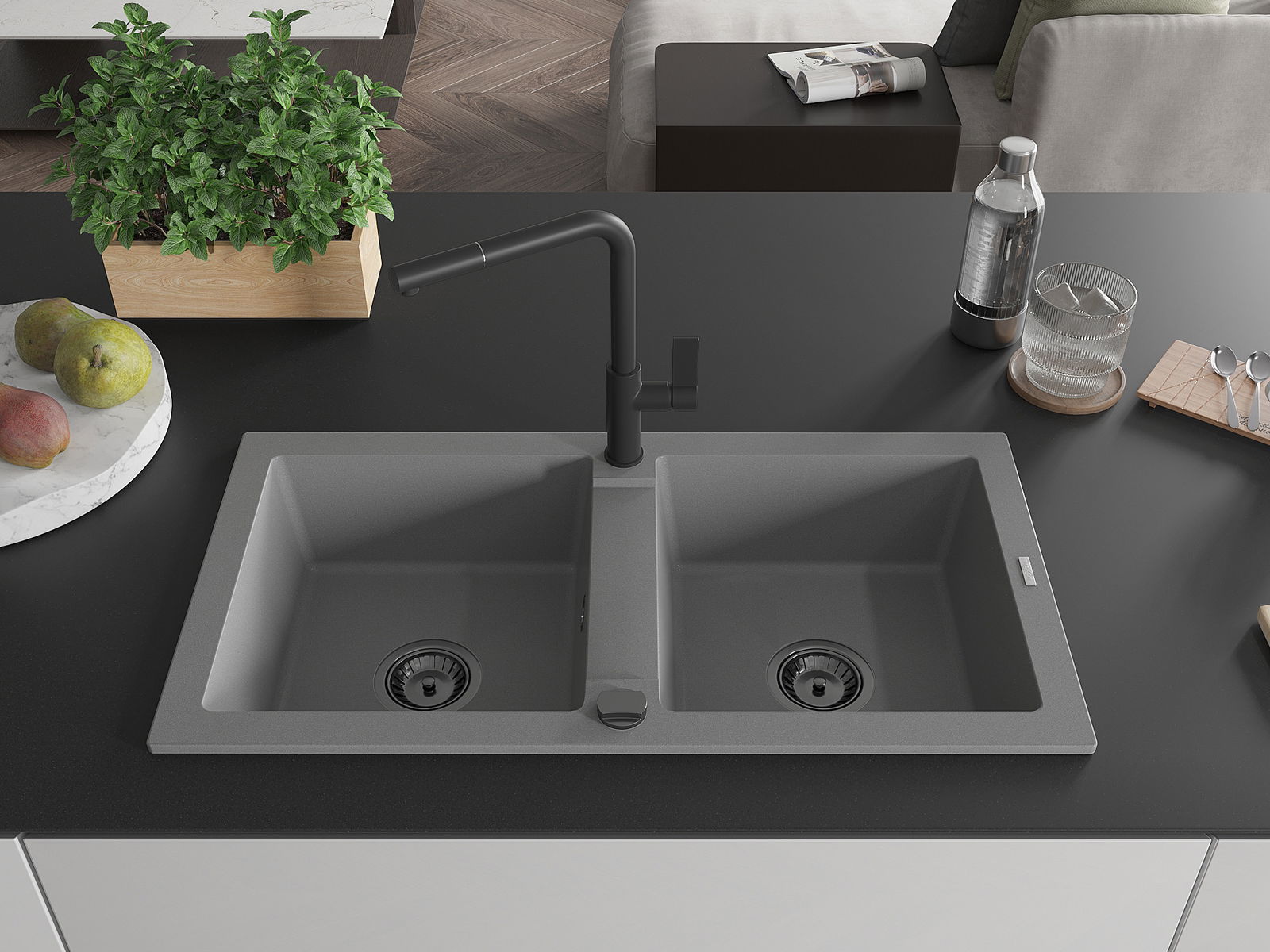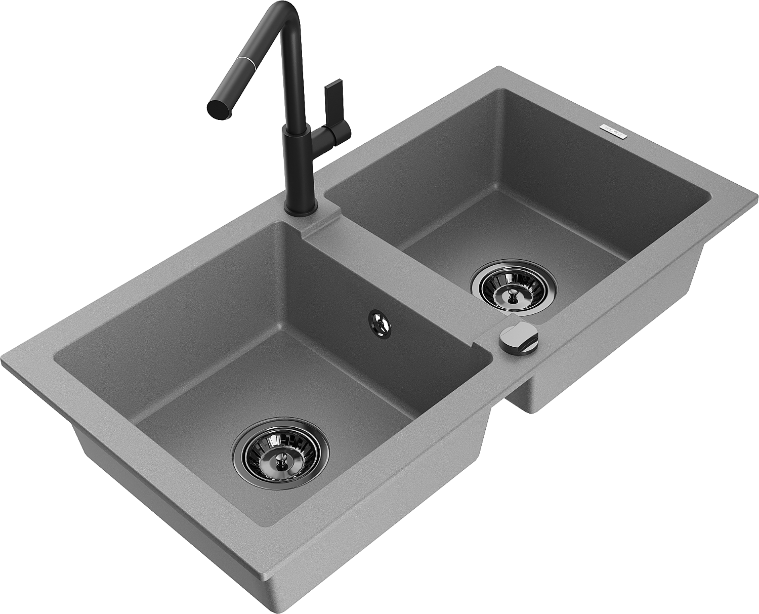Mexen Mario zlewozmywak granitowy 2-komorowy z baterią kuchenną Flora, szary - 6504-71-670401-70-B