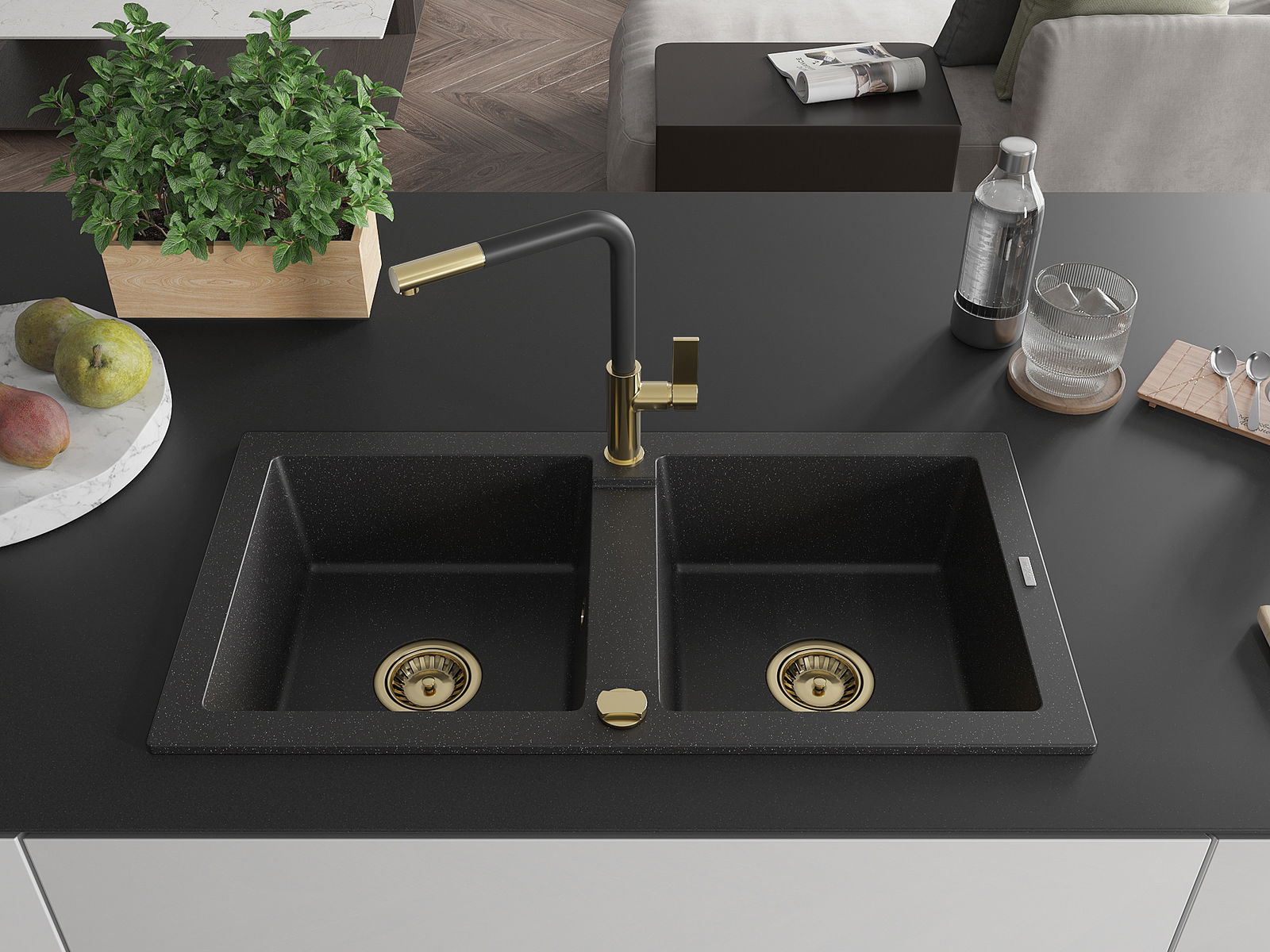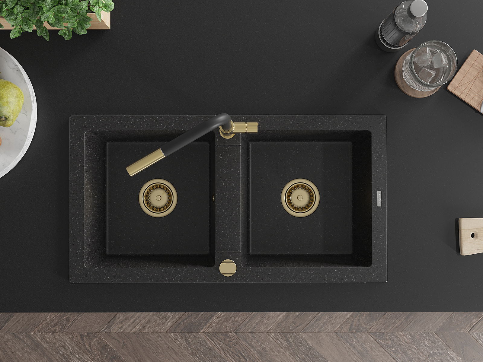 Mexen Mario zlewozmywak granitowy 2-komorowy z baterią kuchenną Flora, czarny/srebrny metalik - 6504-73-670401-57-G