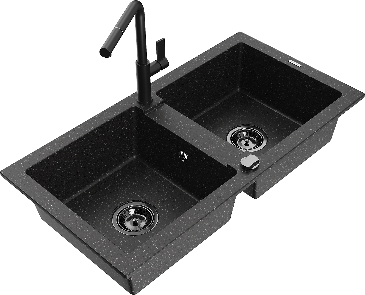 Mexen Mario zlewozmywak granitowy 2-komorowy z baterią kuchenną Flora, czarny/srebrny metalik - 6504-73-670401-70-B