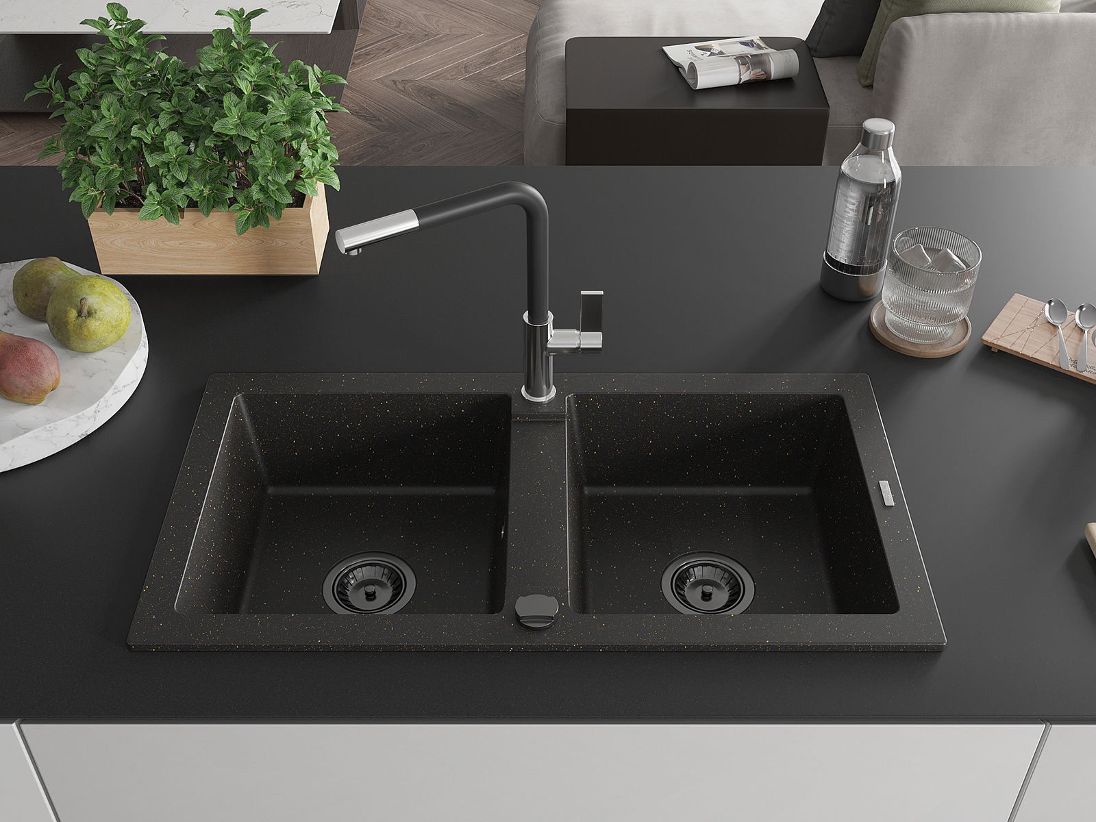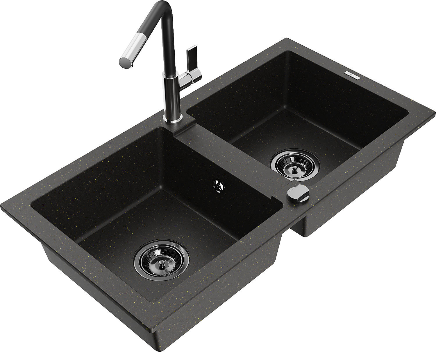Mexen Mario zlewozmywak granitowy 2-komorowy z baterią kuchenną Flora, czarny/złoty metalik - 6504-75-670401-07-B
