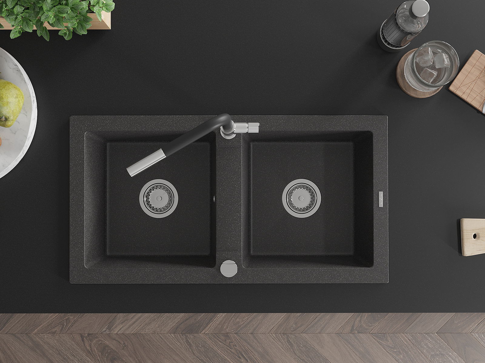 Mexen Mario zlewozmywak granitowy 2-komorowy z baterią kuchenną Flora, czarny nakrapiany - 6504-76-670401-07