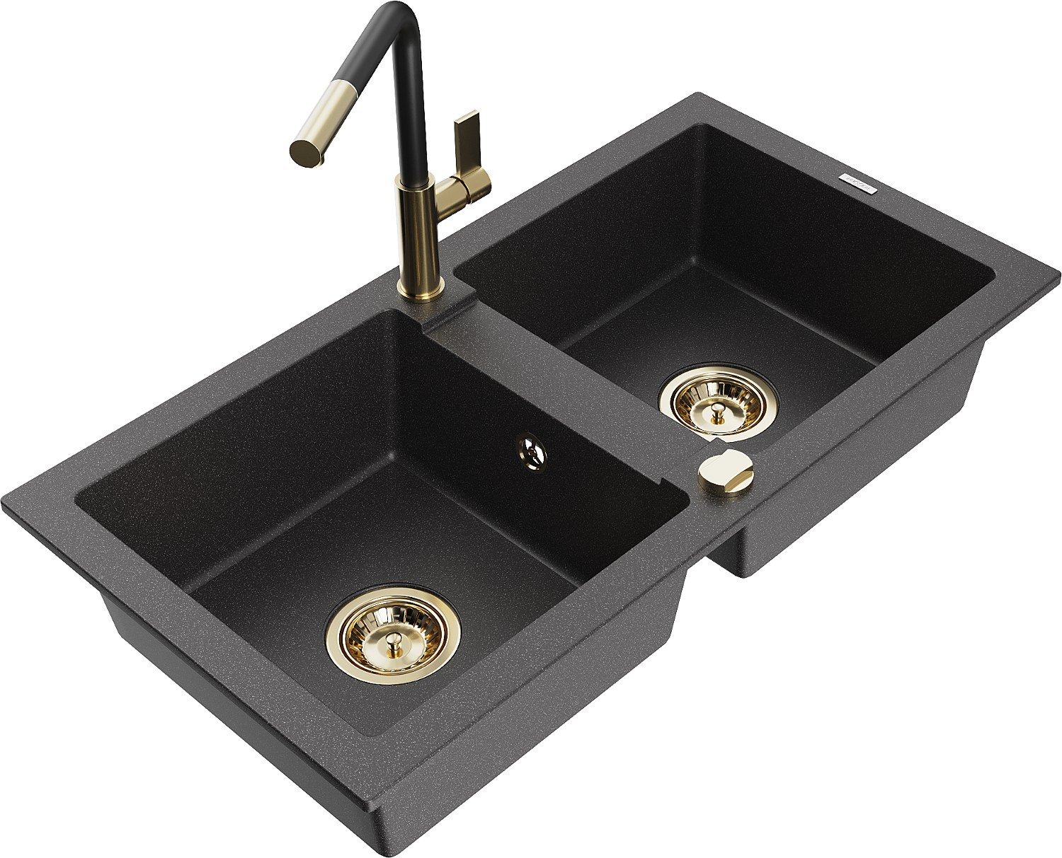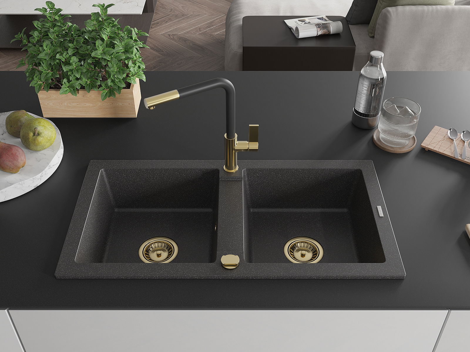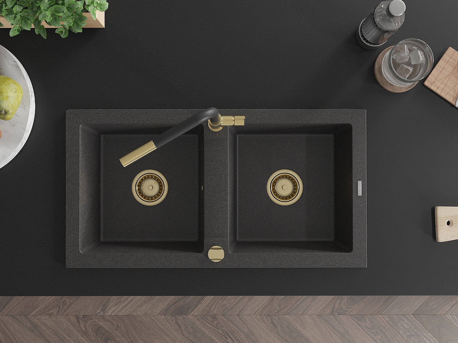 Mexen Mario zlewozmywak granitowy 2-komorowy z baterią kuchenną Flora, czarny nakrapiany - 6504-76-670401-57-G
