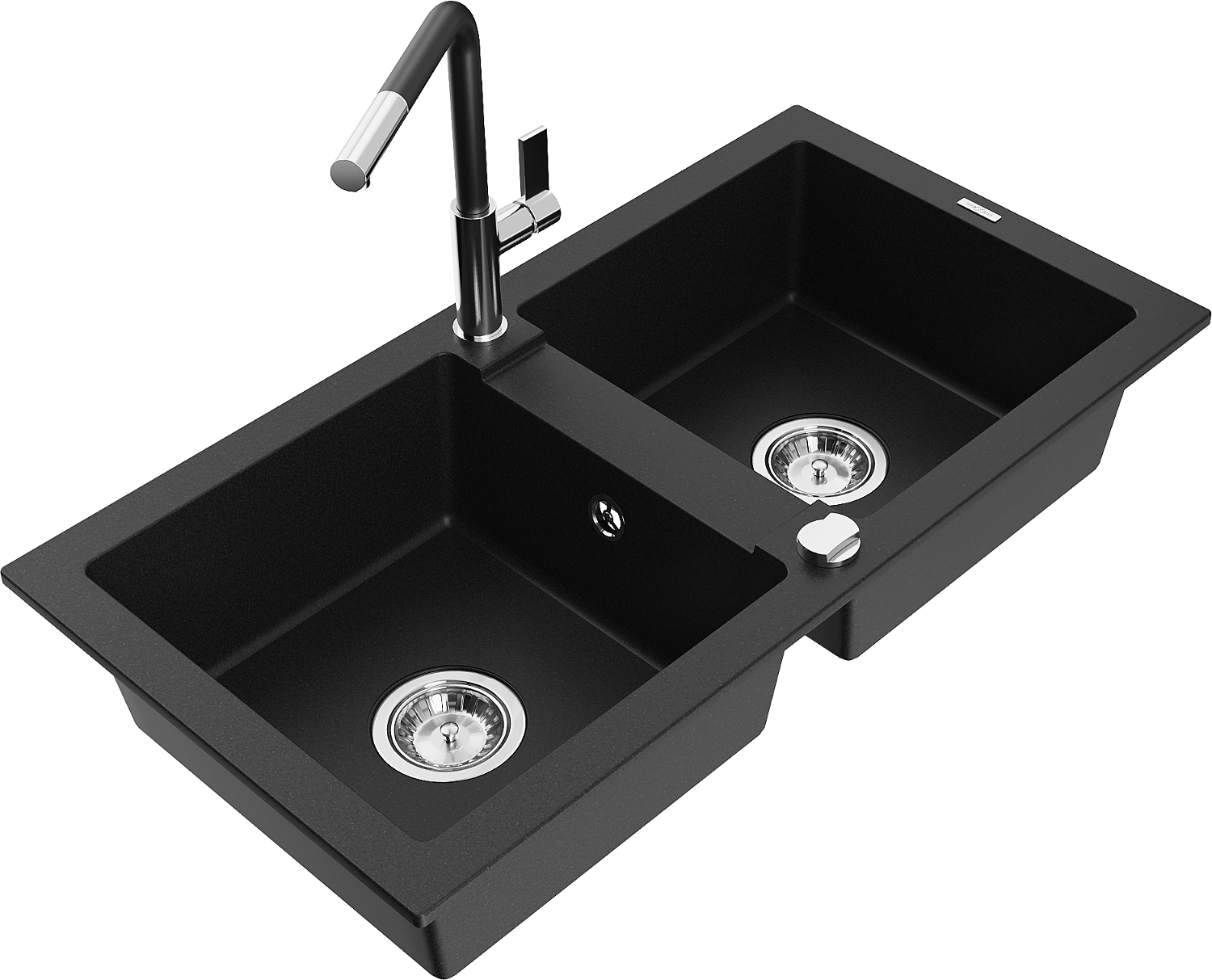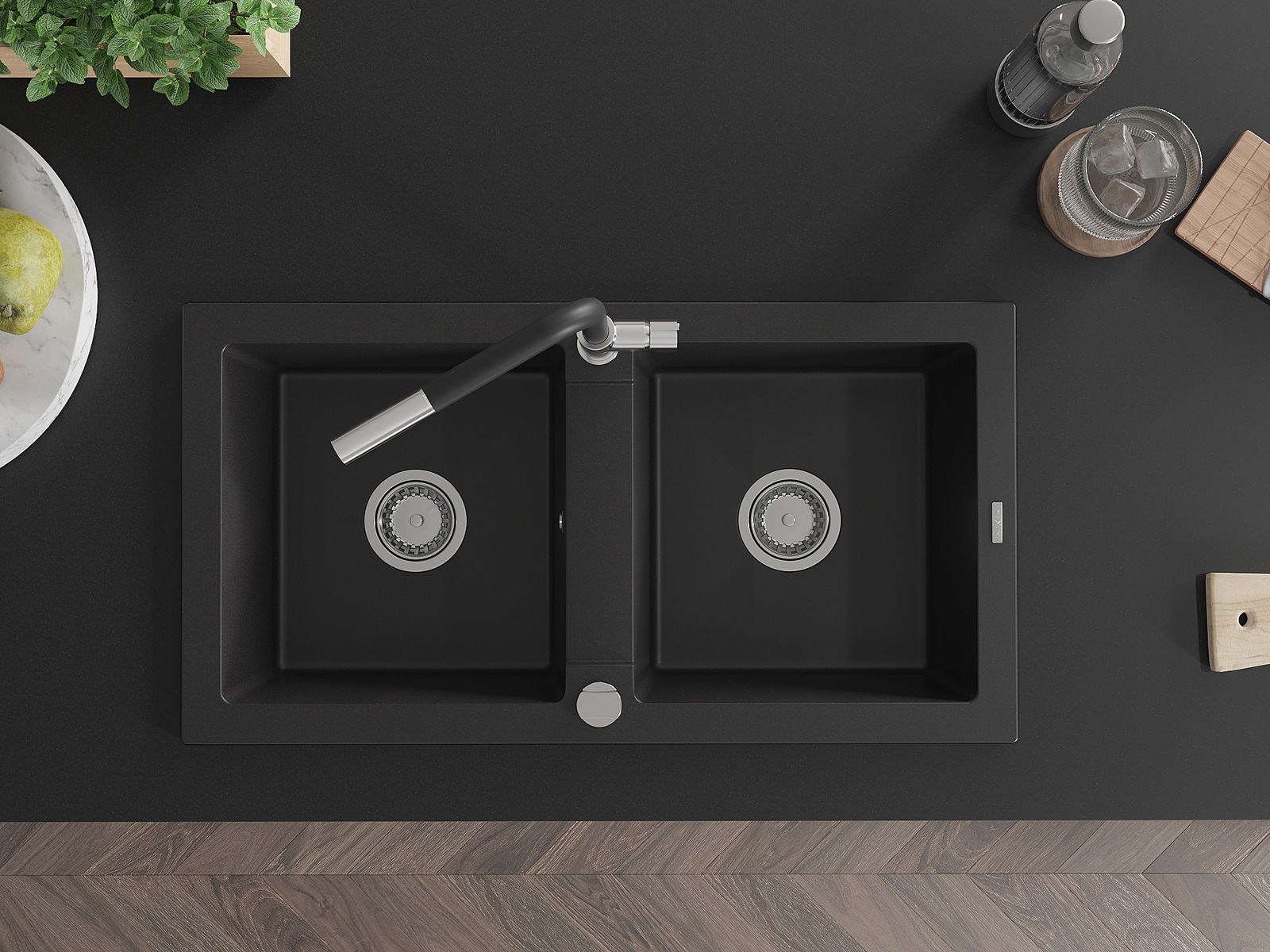 Mexen Mario zlewozmywak granitowy 2-komorowy z baterią kuchenną Flora, czarny - 6504-77-670401-07