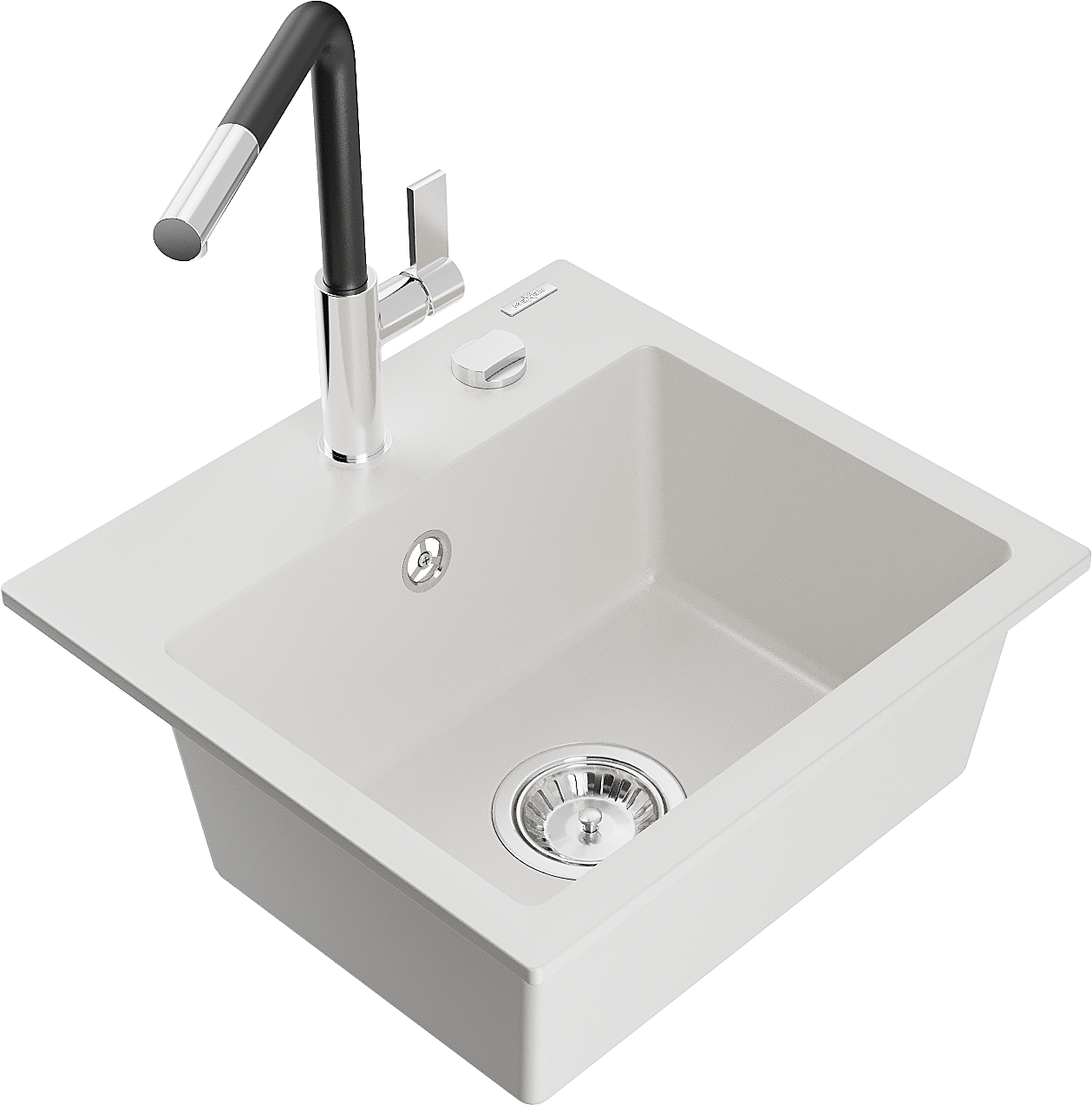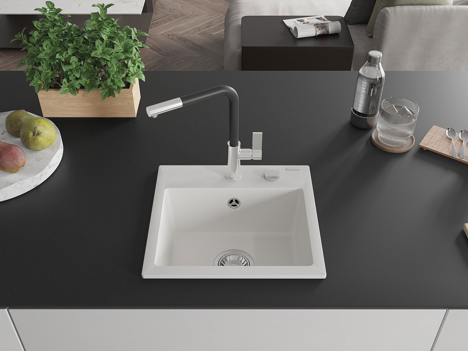 Mexen Milo zlewozmywak granitowy 1-komorowy z baterią kuchenną Flora, biały - 6505-20-670401-07