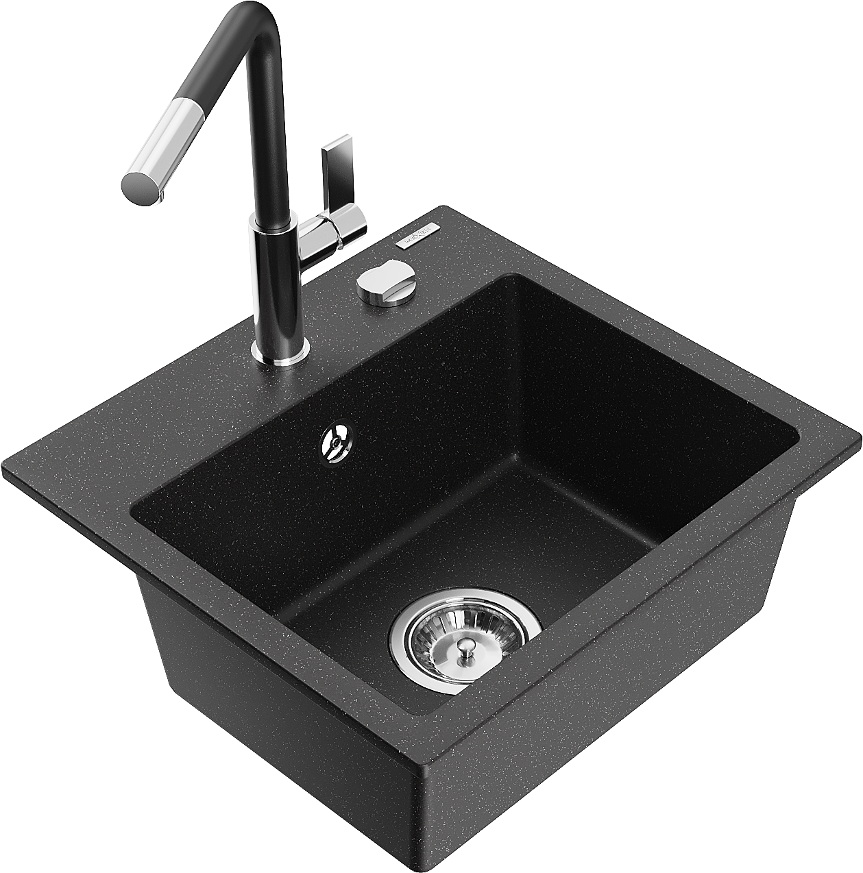 Mexen Milo zlewozmywak granitowy 1-komorowy z baterią kuchenną Flora, czarny/srebrny metalik - 6505-73-670401-07