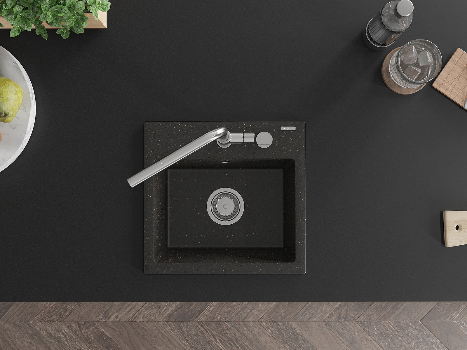 Zlew posiada podfrezowany otwór o średnicy 35 mm do samodzielnego wybicia. Można go wykorzystać m.in. do montażu dozownika na płyn, który wyeliminuje obecność plastikowych butelek w kuchni i nada jej eleganckiego wykończenia.