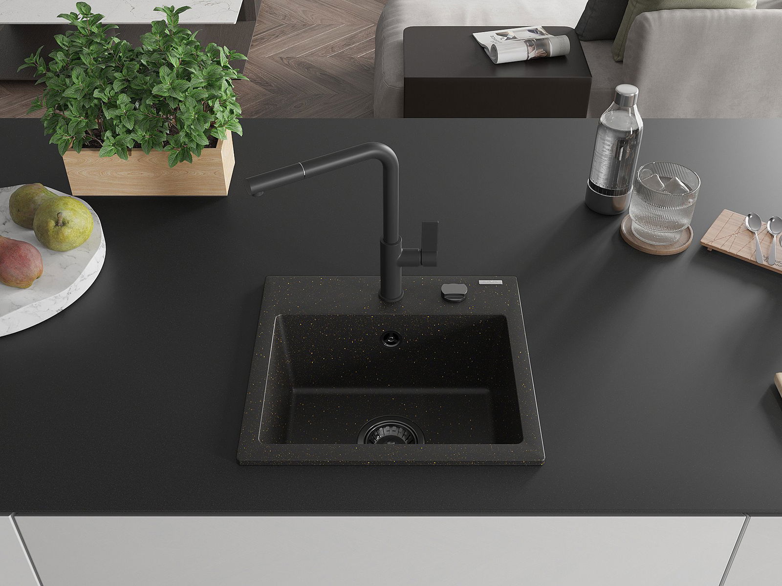 Zlew posiada podfrezowany otwór o średnicy 35 mm do samodzielnego wybicia. Można go wykorzystać m.in. do montażu dozownika na płyn, który wyeliminuje obecność plastikowych butelek w kuchni i nada jej eleganckiego wykończenia.