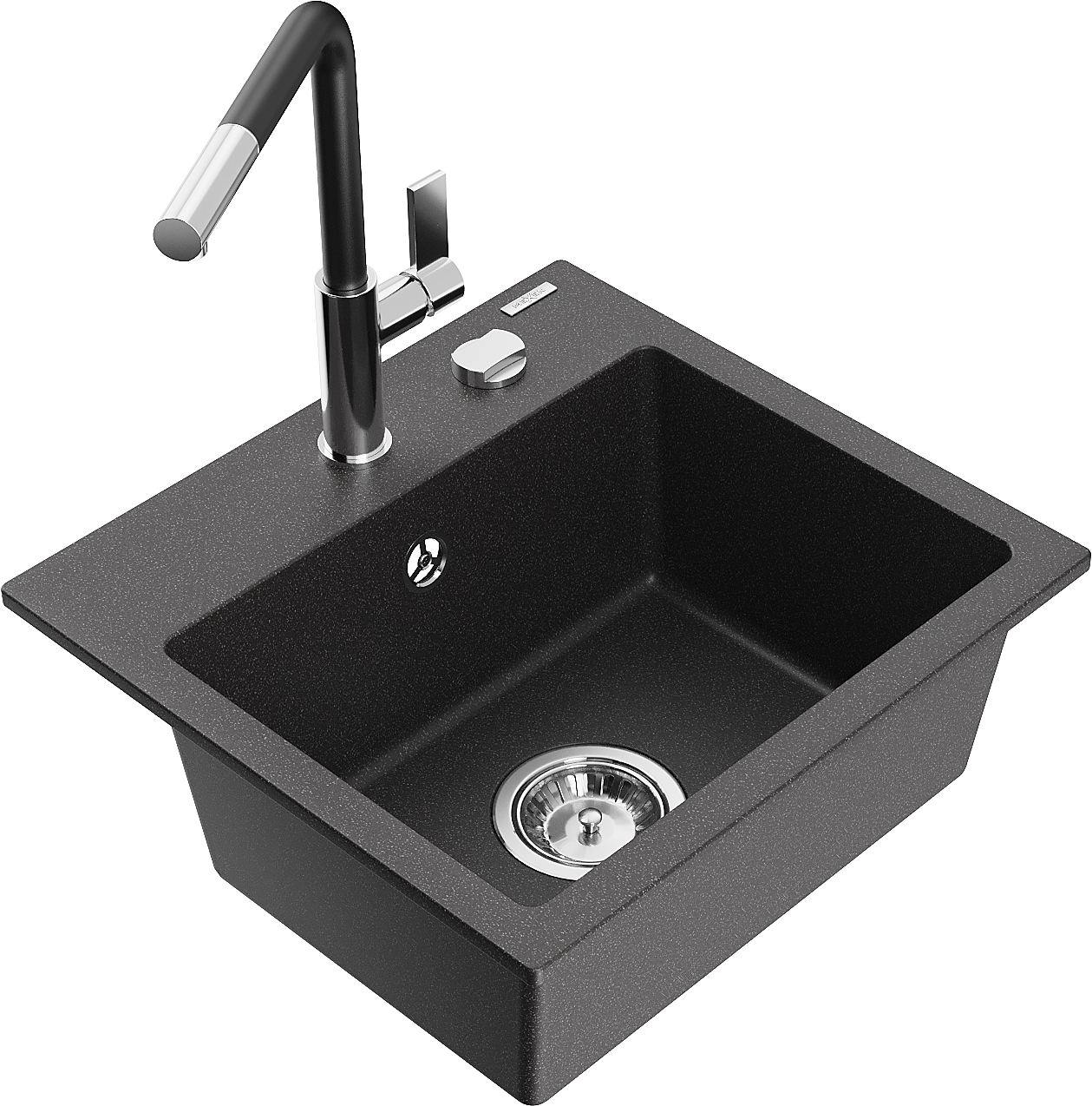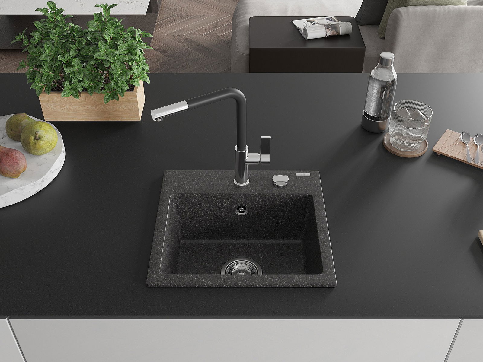Mexen Milo zlewozmywak granitowy 1-komorowy z baterią kuchenną Flora, czarny nakrapiany - 6505-76-670401-07