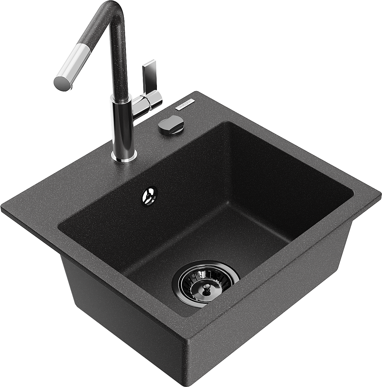 Mexen Milo zlewozmywak granitowy 1-komorowy z baterią kuchenną Flora, czarny nakrapiany - 6505-76-670401-08-B