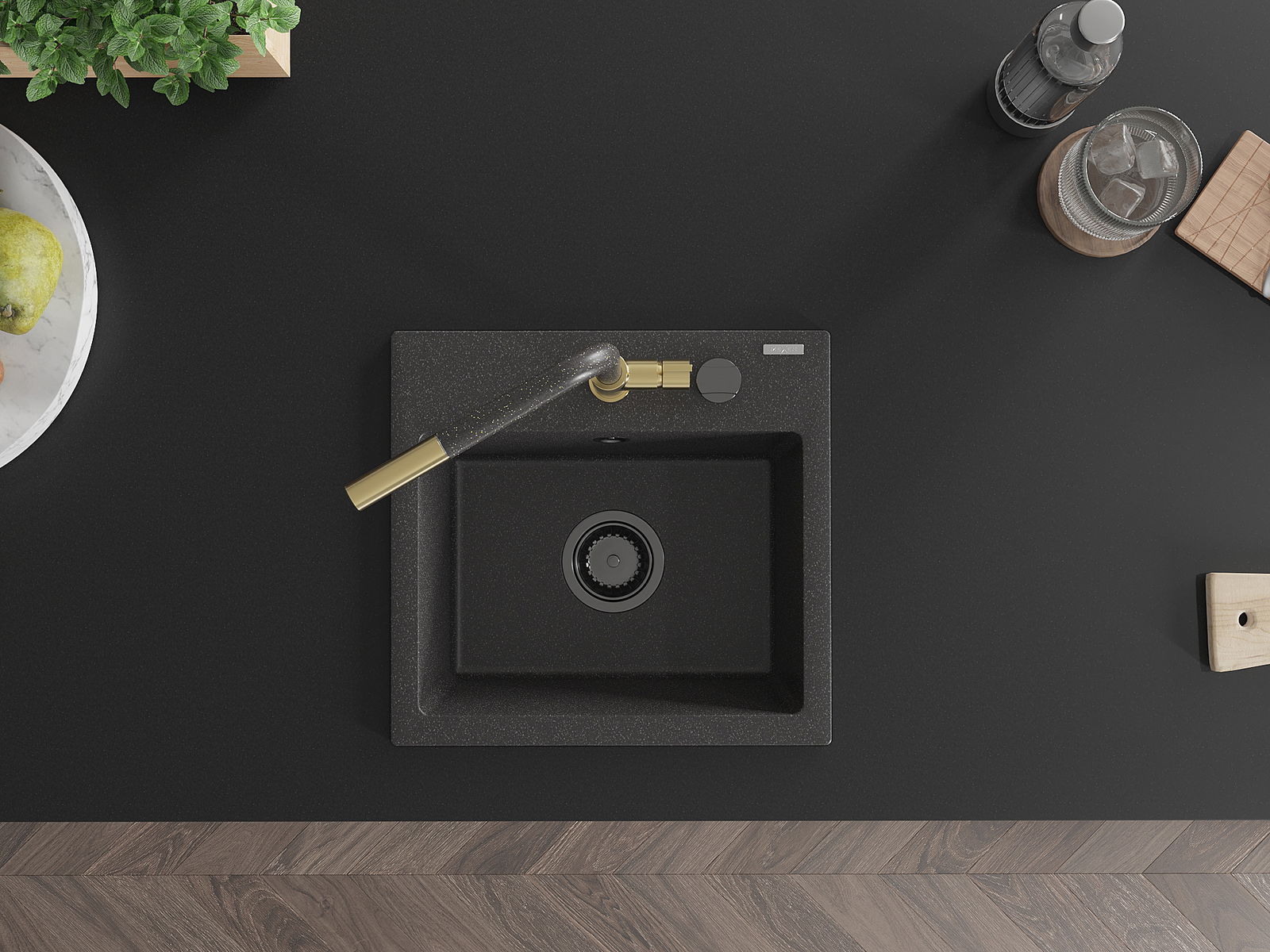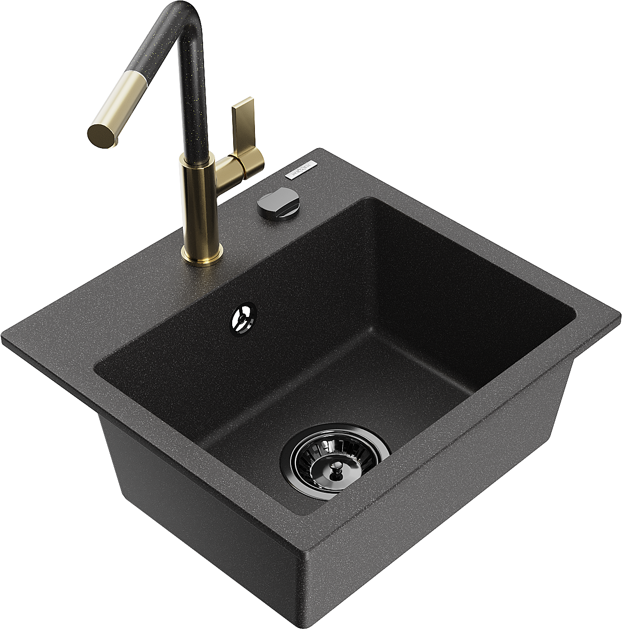 Mexen Milo zlewozmywak granitowy 1-komorowy z baterią kuchenną Flora, czarny nakrapiany - 6505-76-670401-75-B