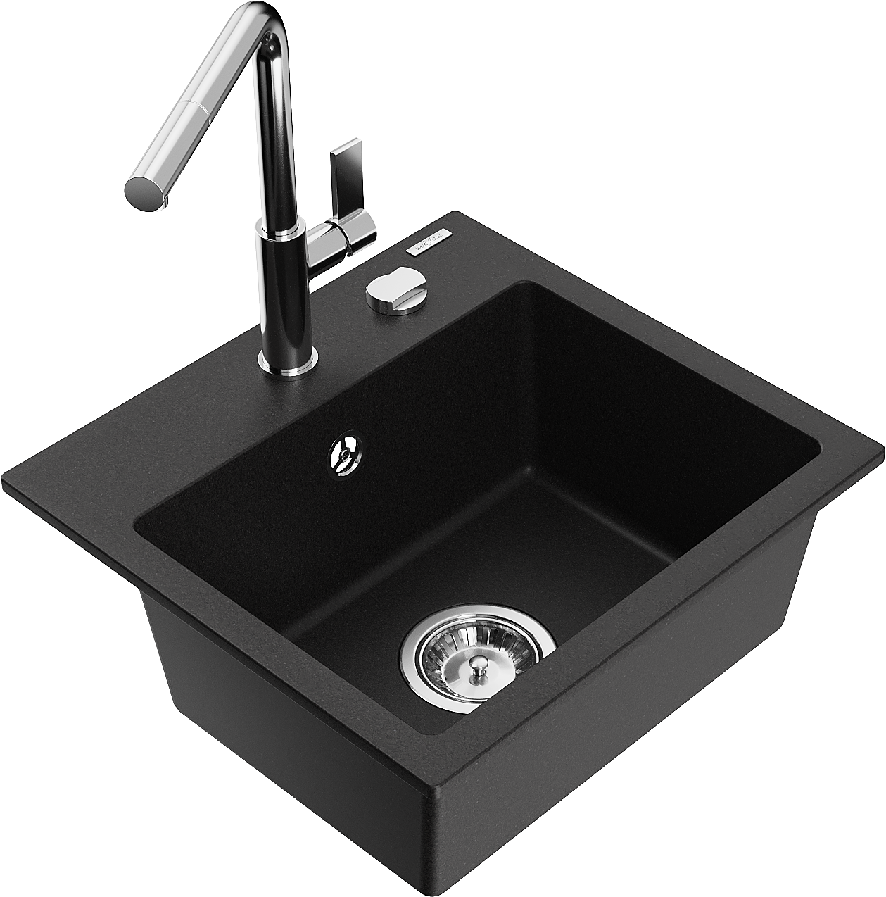 Mexen Milo zlewozmywak granitowy 1-komorowy z baterią kuchenną Flora, czarny - 6505-77-670401-00
