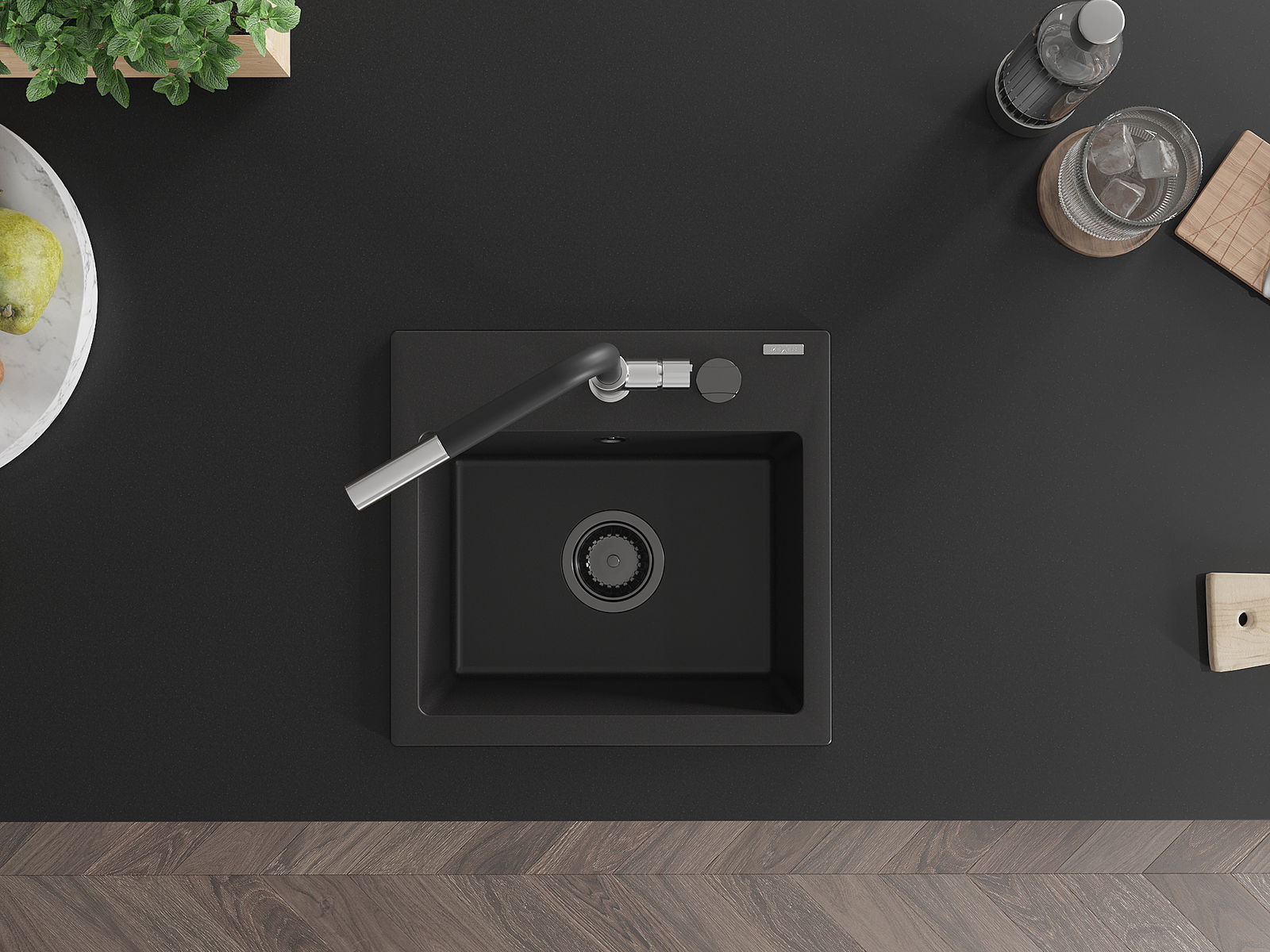 Mexen Milo zlewozmywak granitowy 1-komorowy z baterią kuchenną Flora, czarny - 6505-77-670401-07-B