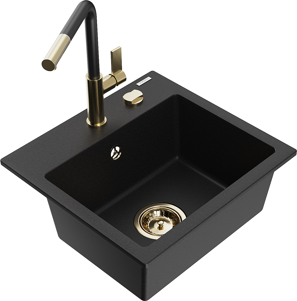 Mexen Milo zlewozmywak granitowy 1-komorowy z baterią kuchenną Flora, czarny - 6505-77-670401-57-G