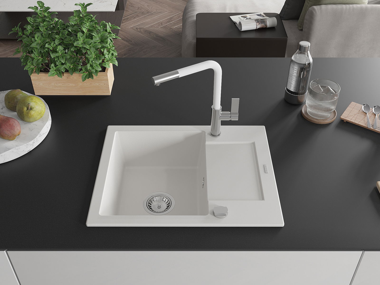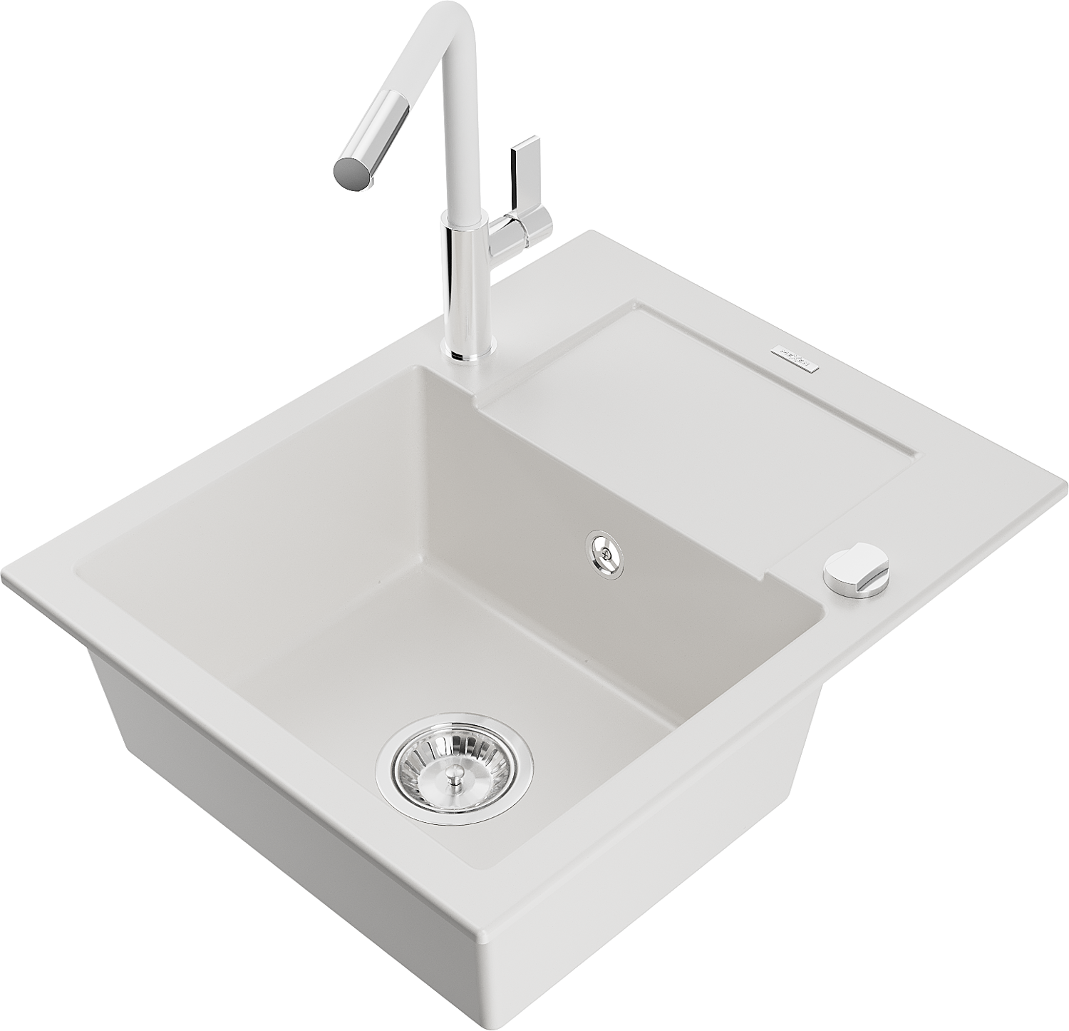 Mexen Enzo zlewozmywak granitowy 1-komorowy z ociekaczem i baterią kuchenną Flora, biały - 6506-20-670401-02