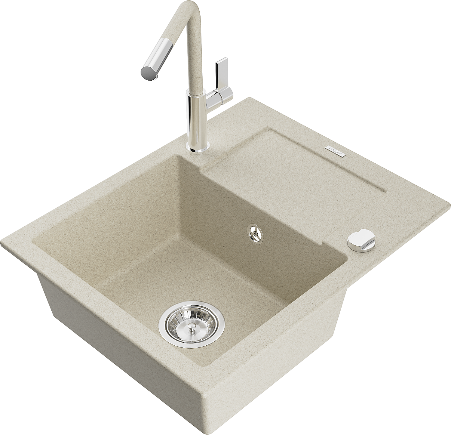 Mexen Enzo zlewozmywak granitowy 1-komorowy z ociekaczem i baterią kuchenną Flora, beżowy - 6506-69-670401-09