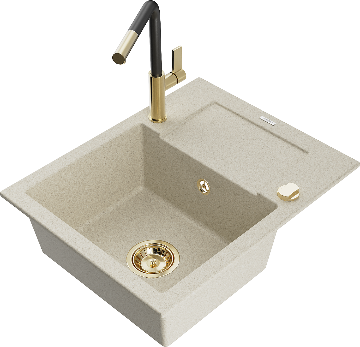 Mexen Enzo zlewozmywak granitowy 1-komorowy z ociekaczem i baterią kuchenną Flora, beżowy - 6506-69-670401-57-G
