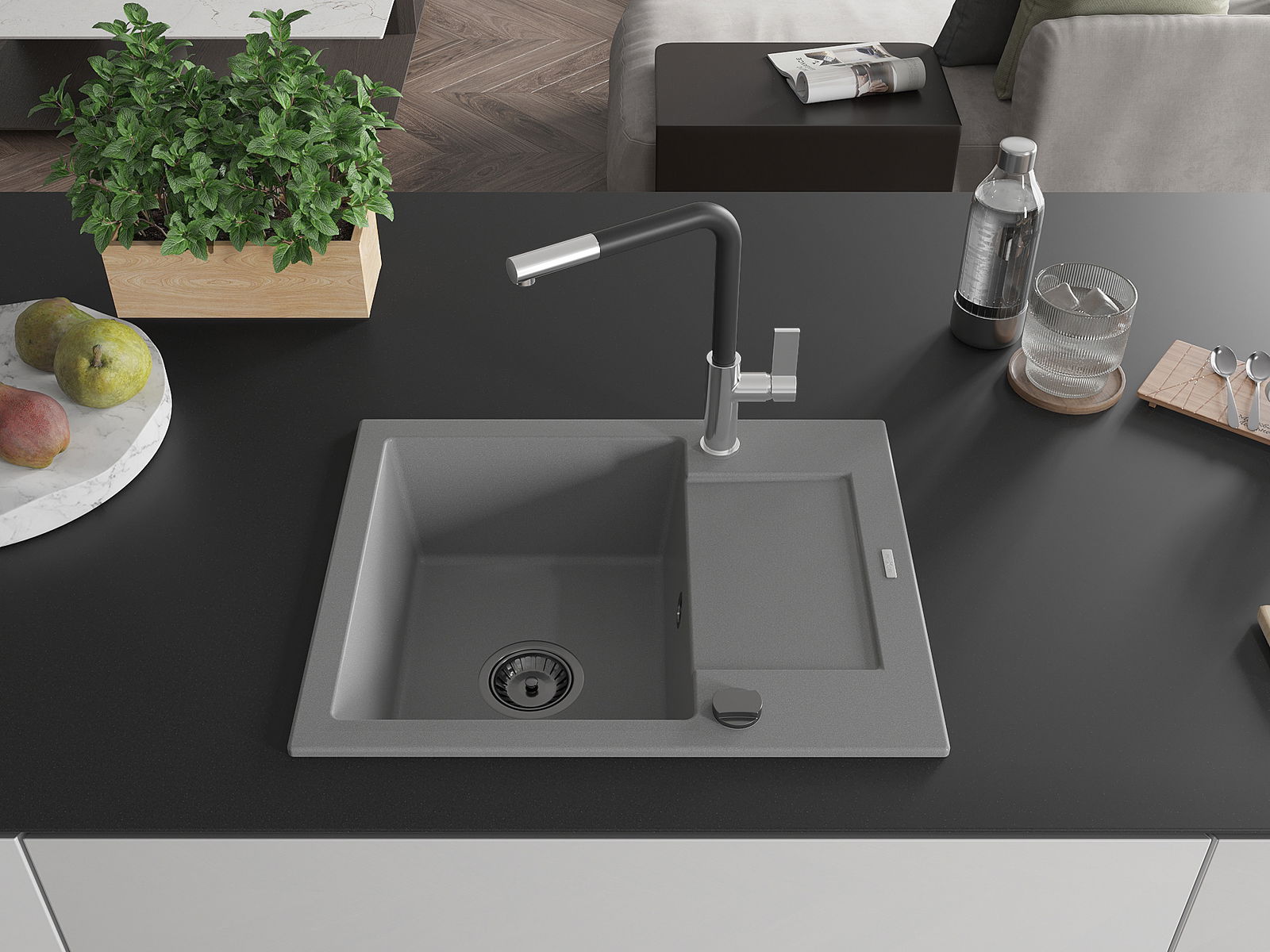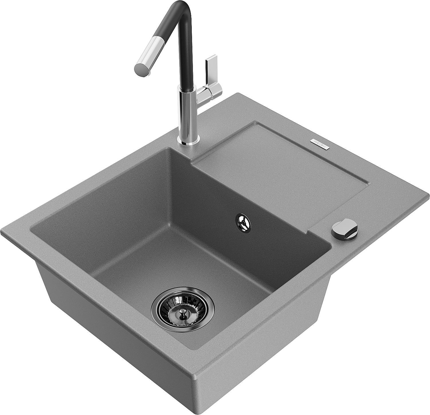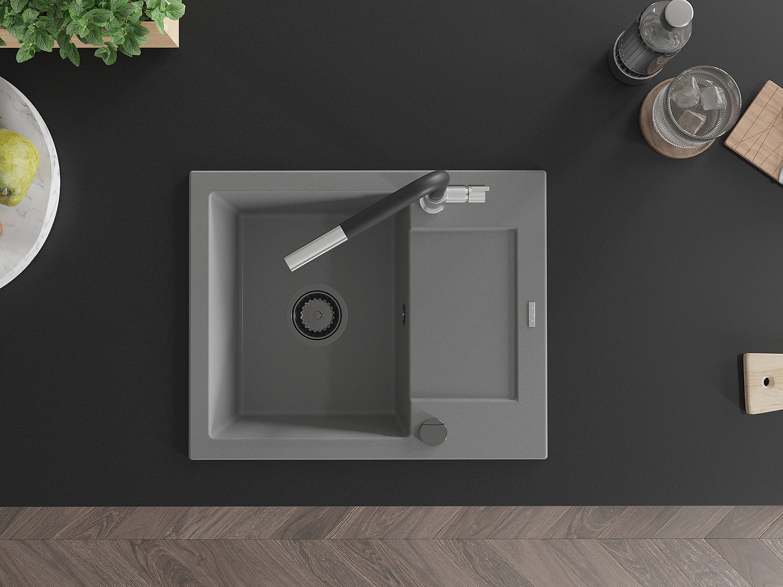 Mexen Enzo zlewozmywak granitowy 1-komorowy z ociekaczem i baterią kuchenną Flora, szary - 6506-71-670401-07-B