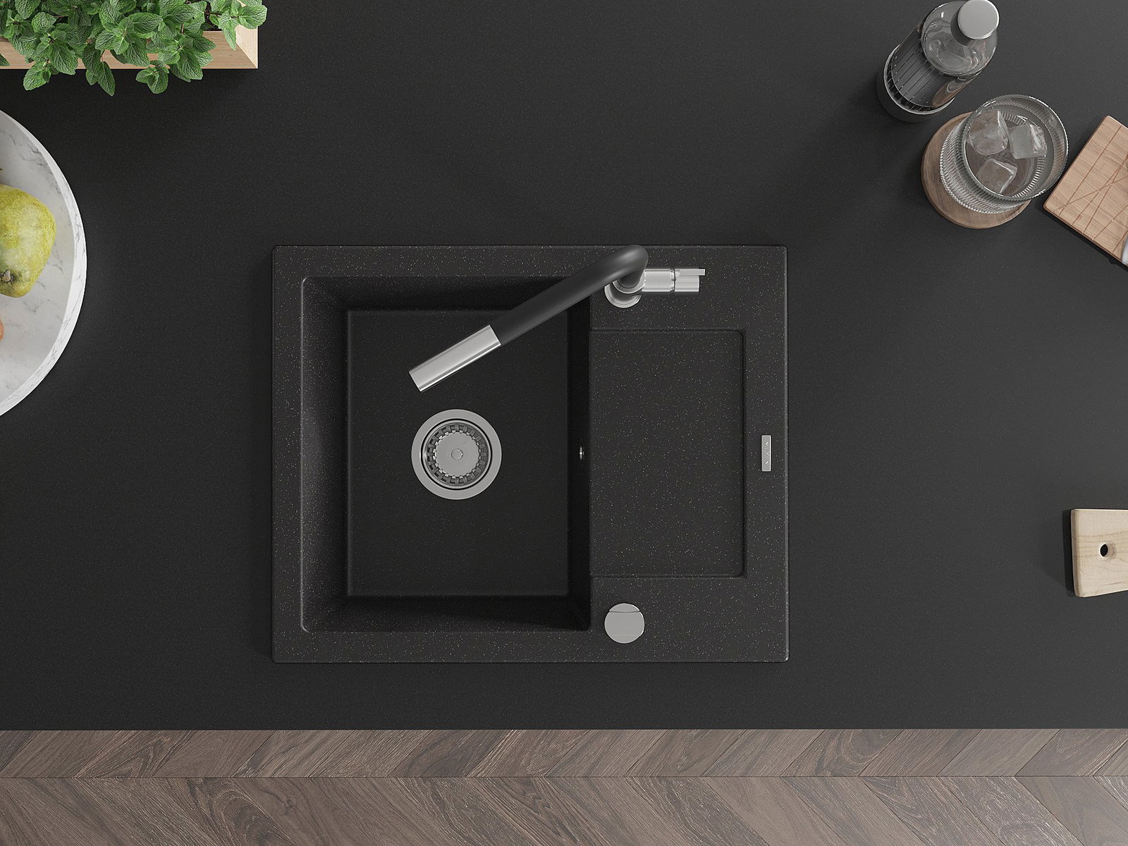 Mexen Enzo zlewozmywak granitowy 1-komorowy z ociekaczem i baterią kuchenną Flora, czarny/srebrny metalik - 6506-73-670401-07