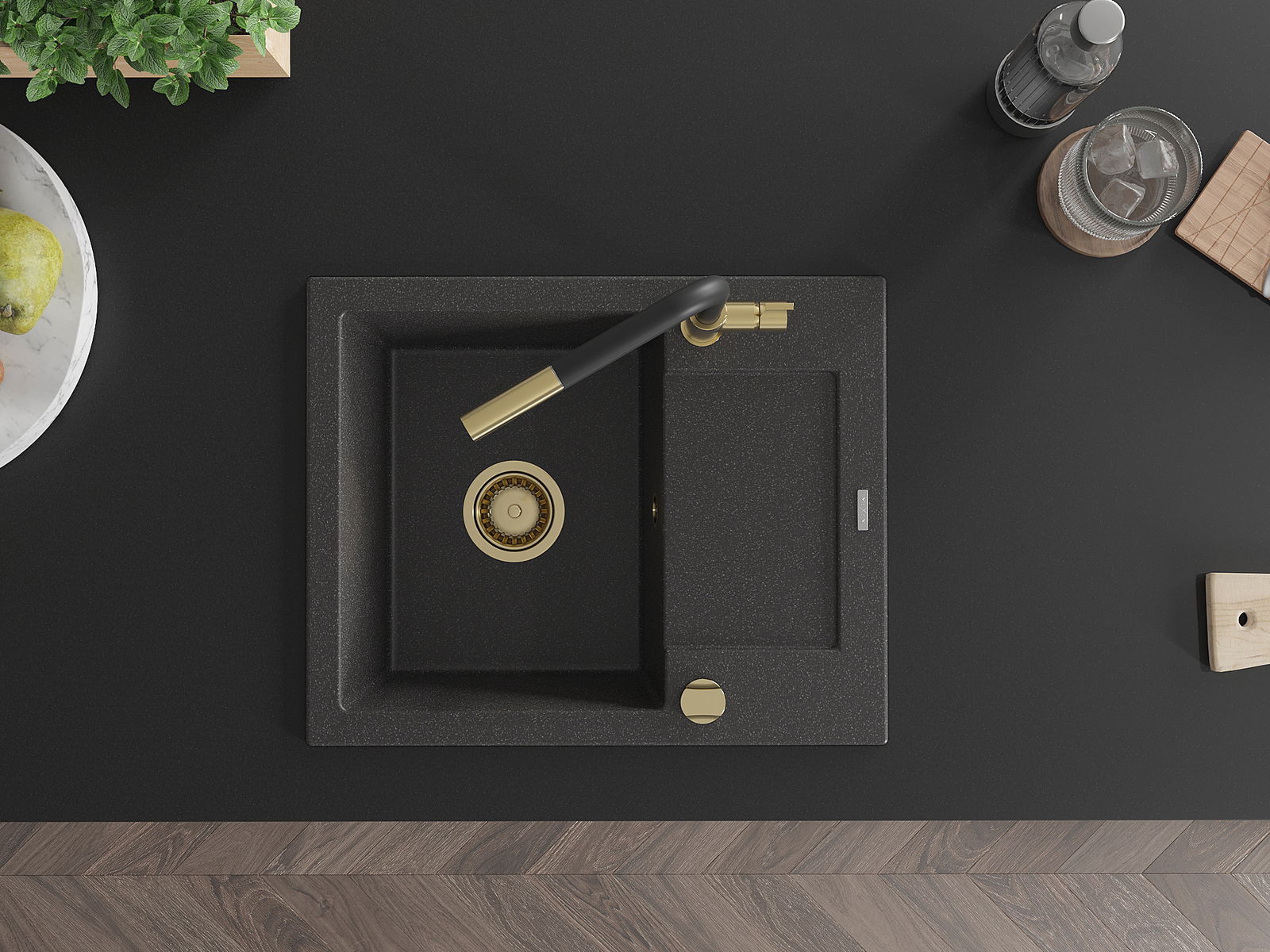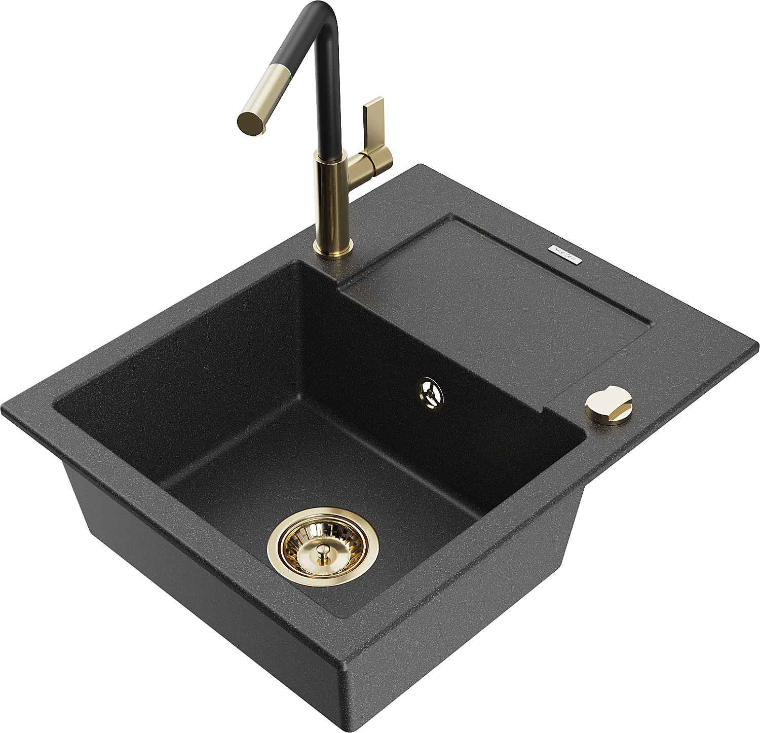 Mexen Enzo zlewozmywak granitowy 1-komorowy z ociekaczem i baterią kuchenną Flora, czarny nakrapiany - 6506-76-670401-57-G