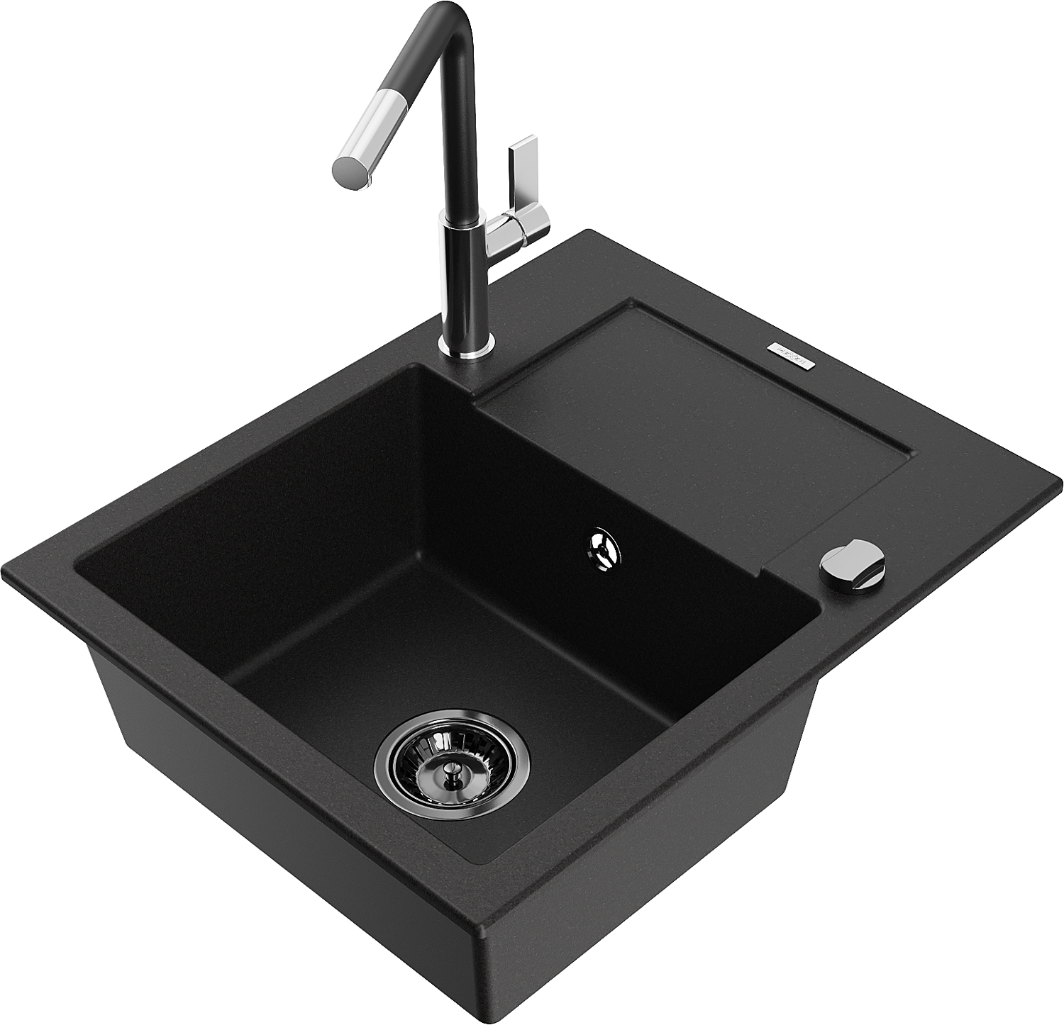 Mexen Enzo zlewozmywak granitowy 1-komorowy z ociekaczem i baterią kuchenną Flora, czarny - 6506-77-670401-07-B