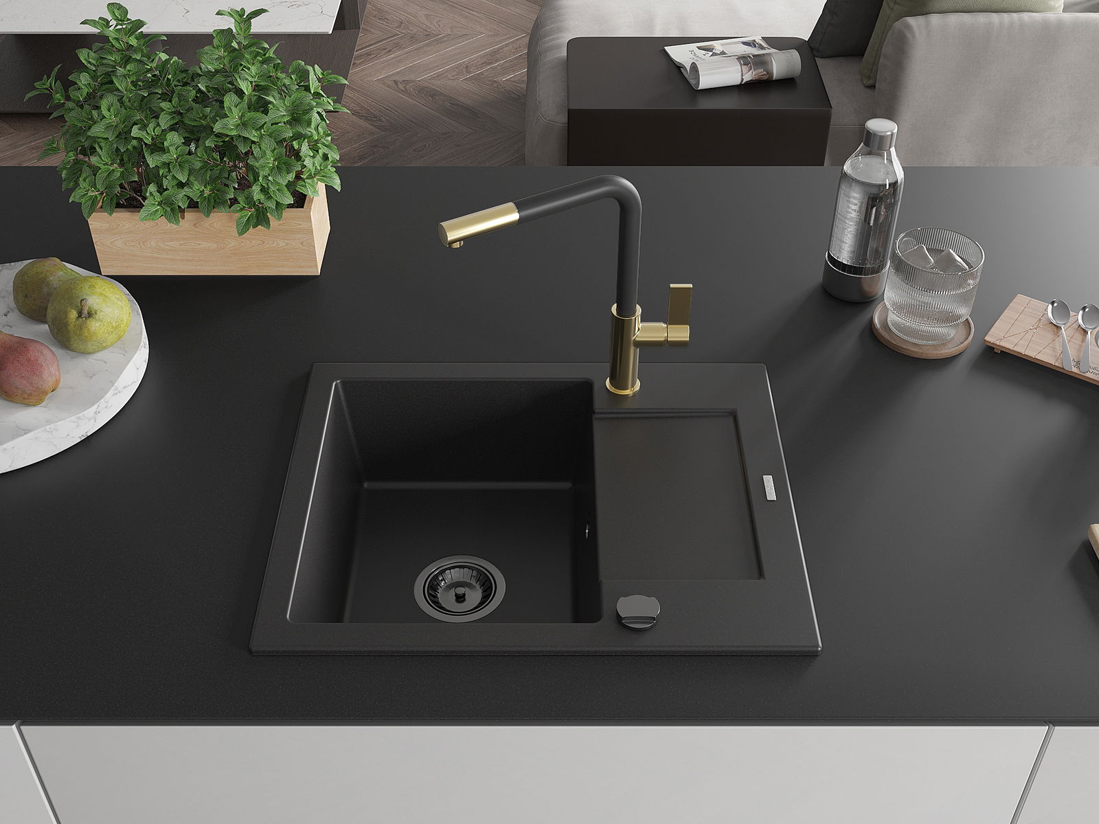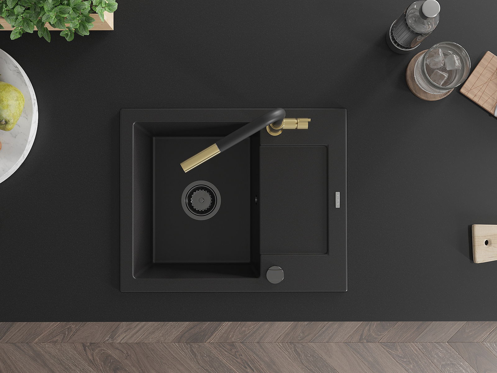 Mexen Enzo zlewozmywak granitowy 1-komorowy z ociekaczem i baterią kuchenną Flora, czarny - 6506-77-670401-57-B