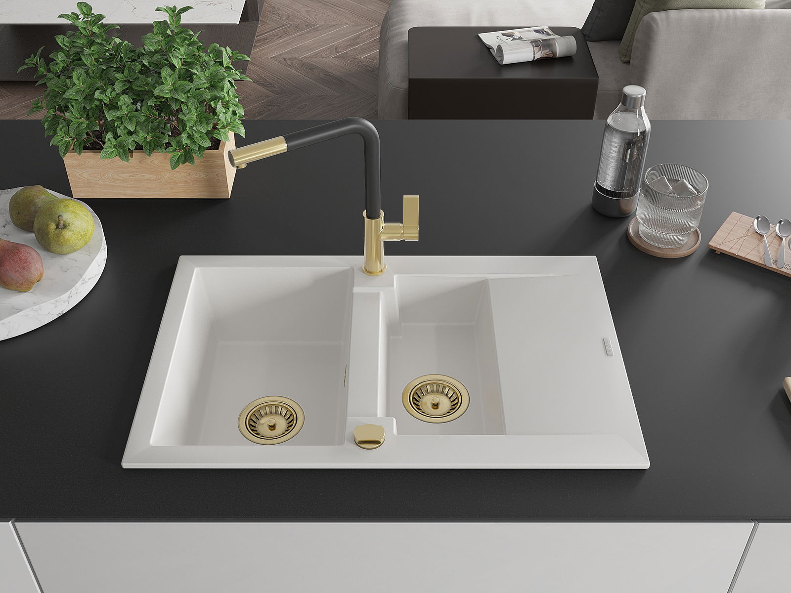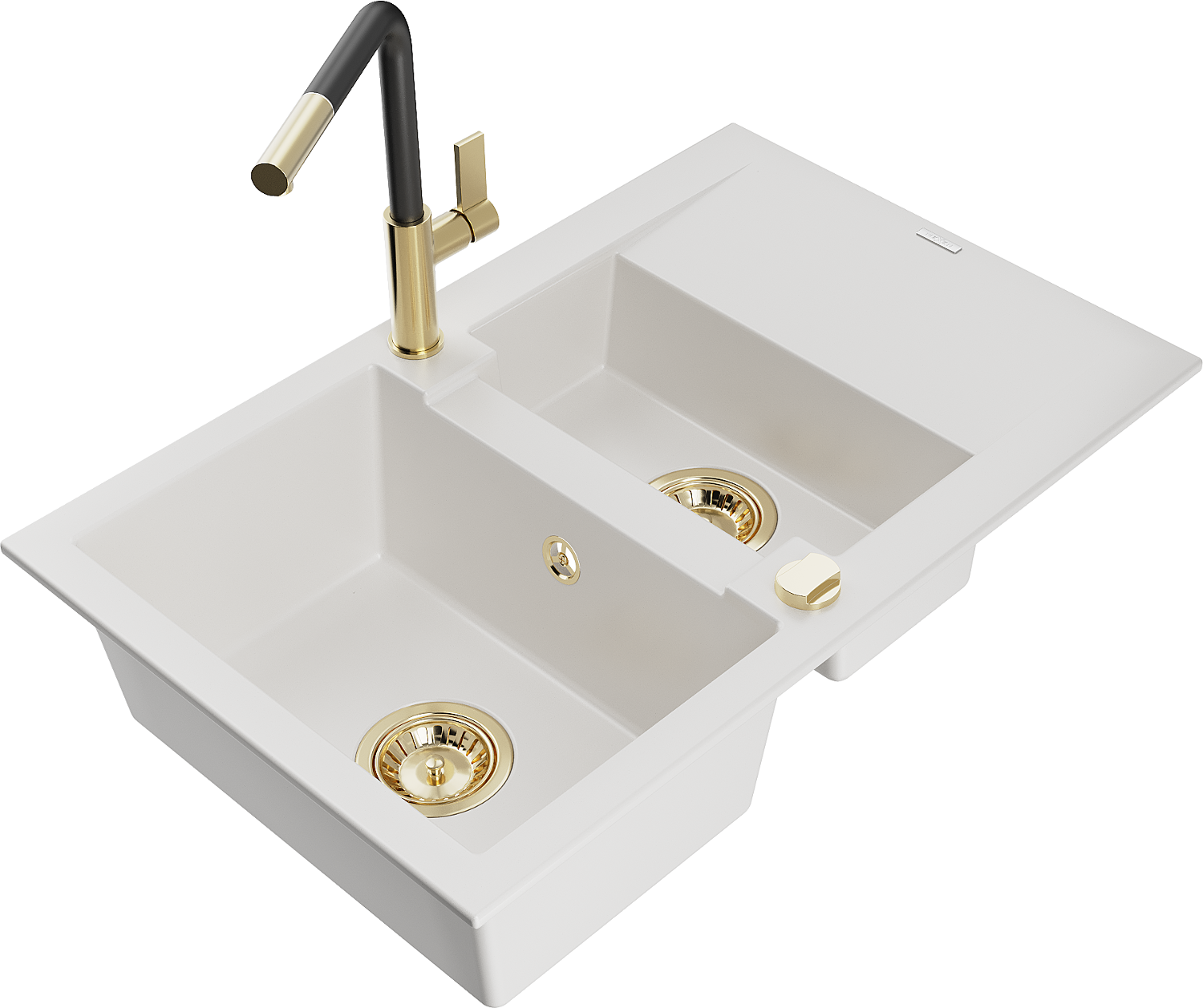 Mexen Gaspar zlewozmywak granitowy 1,5-komorowy z ociekaczem i baterią kuchenną Flora, biały - 6507-20-670401-57-G