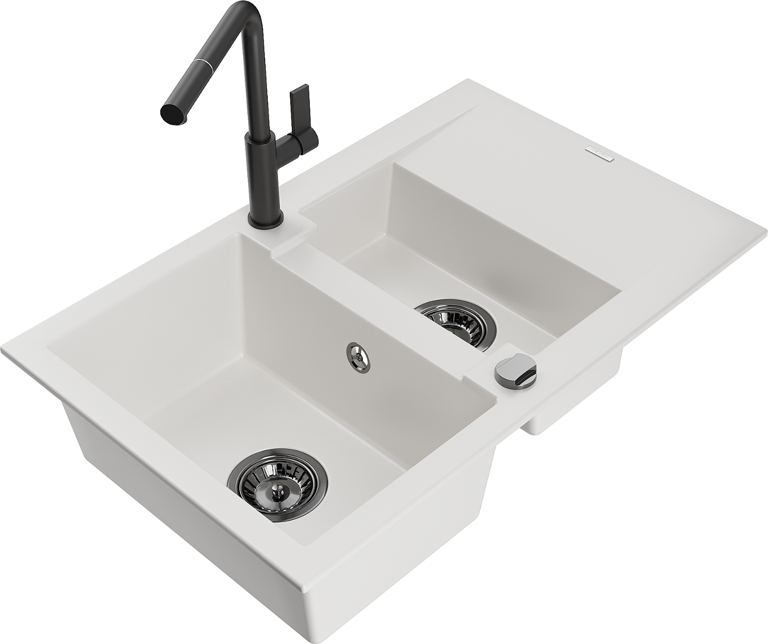 Mexen Gaspar zlewozmywak granitowy 1,5-komorowy z ociekaczem i baterią kuchenną Flora, biały - 6507-20-670401-70-B
