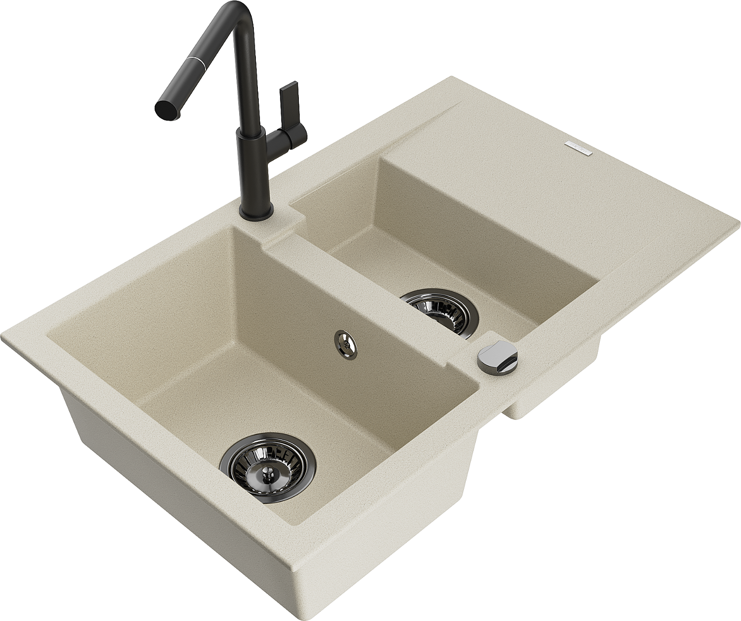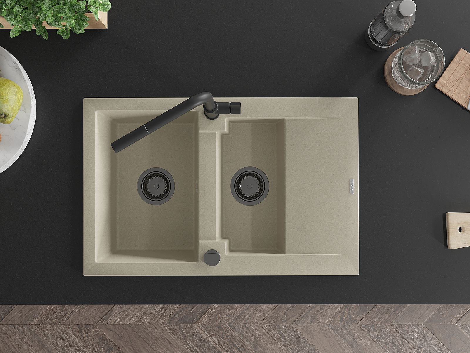 Mexen Gaspar zlewozmywak granitowy 1,5-komorowy z ociekaczem i baterią kuchenną Flora, beżowy - 6507-69-670401-70-B
