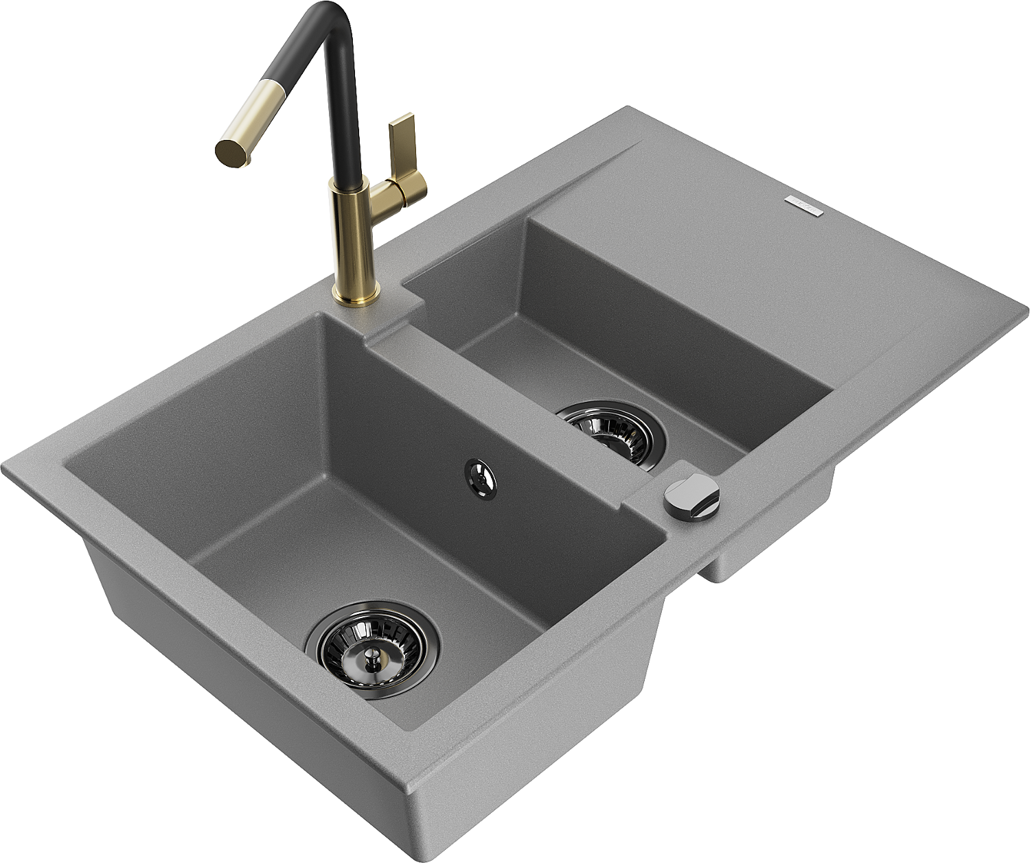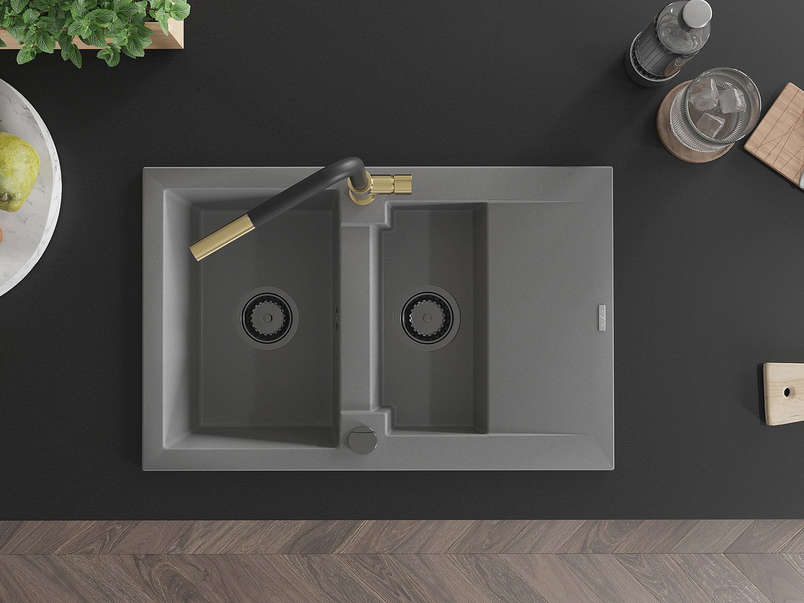 Mexen Gaspar zlewozmywak granitowy 1,5-komorowy z ociekaczem i baterią kuchenną Flora, szary - 6507-71-670401-57-B