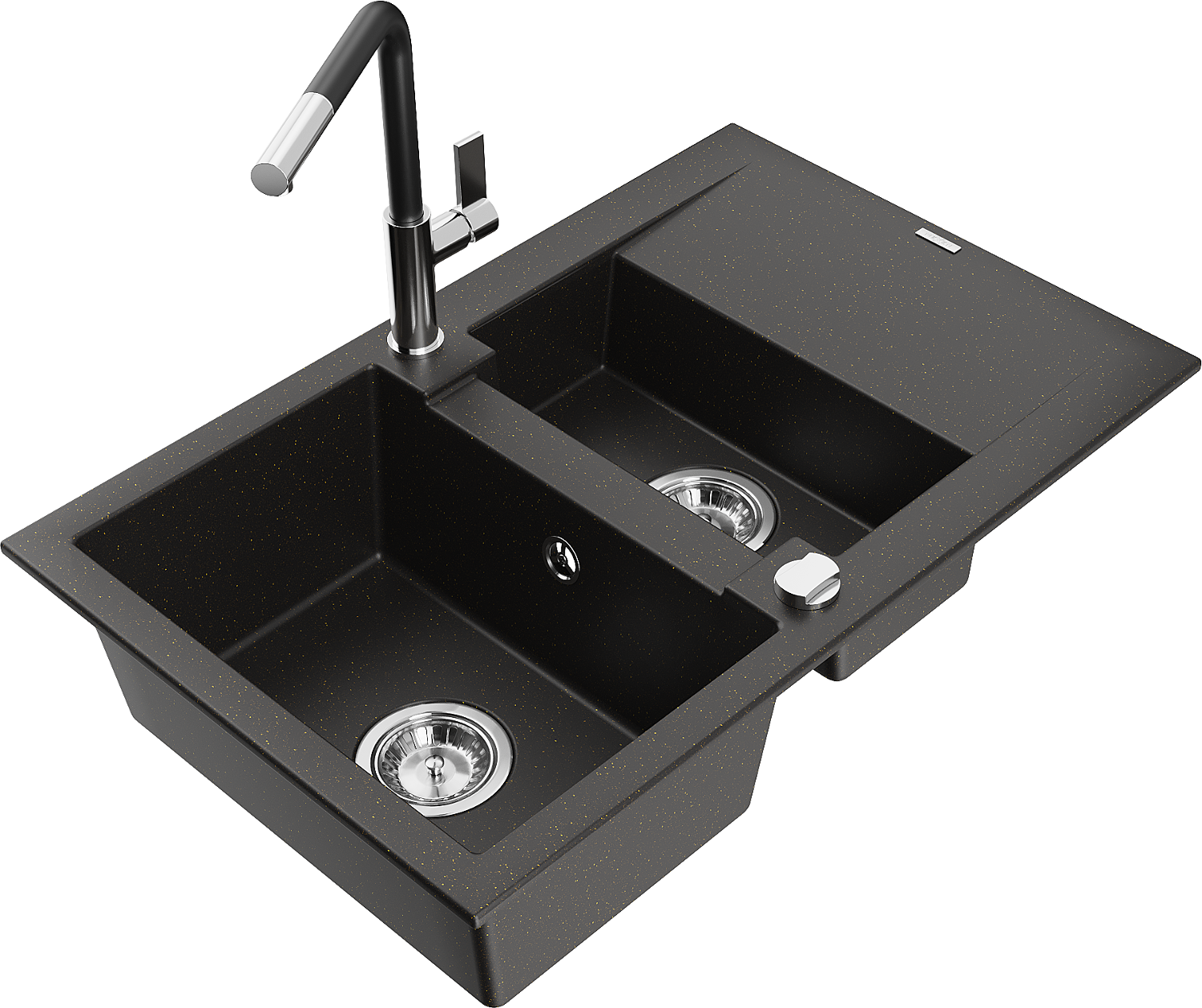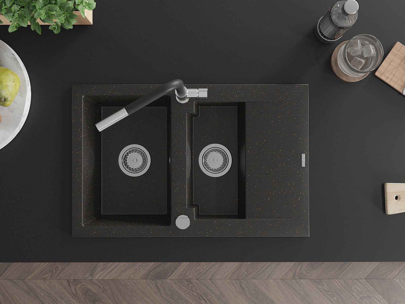Mexen Gaspar zlewozmywak granitowy 1,5-komorowy z ociekaczem i baterią kuchenną Flora, czarny/złoty metalik - 6507-75-670401-07