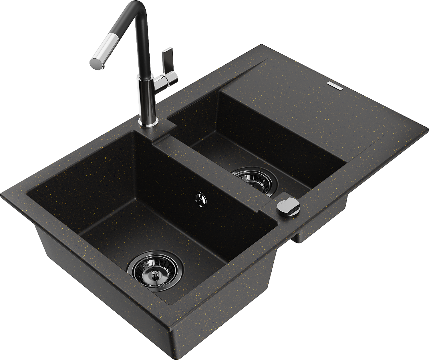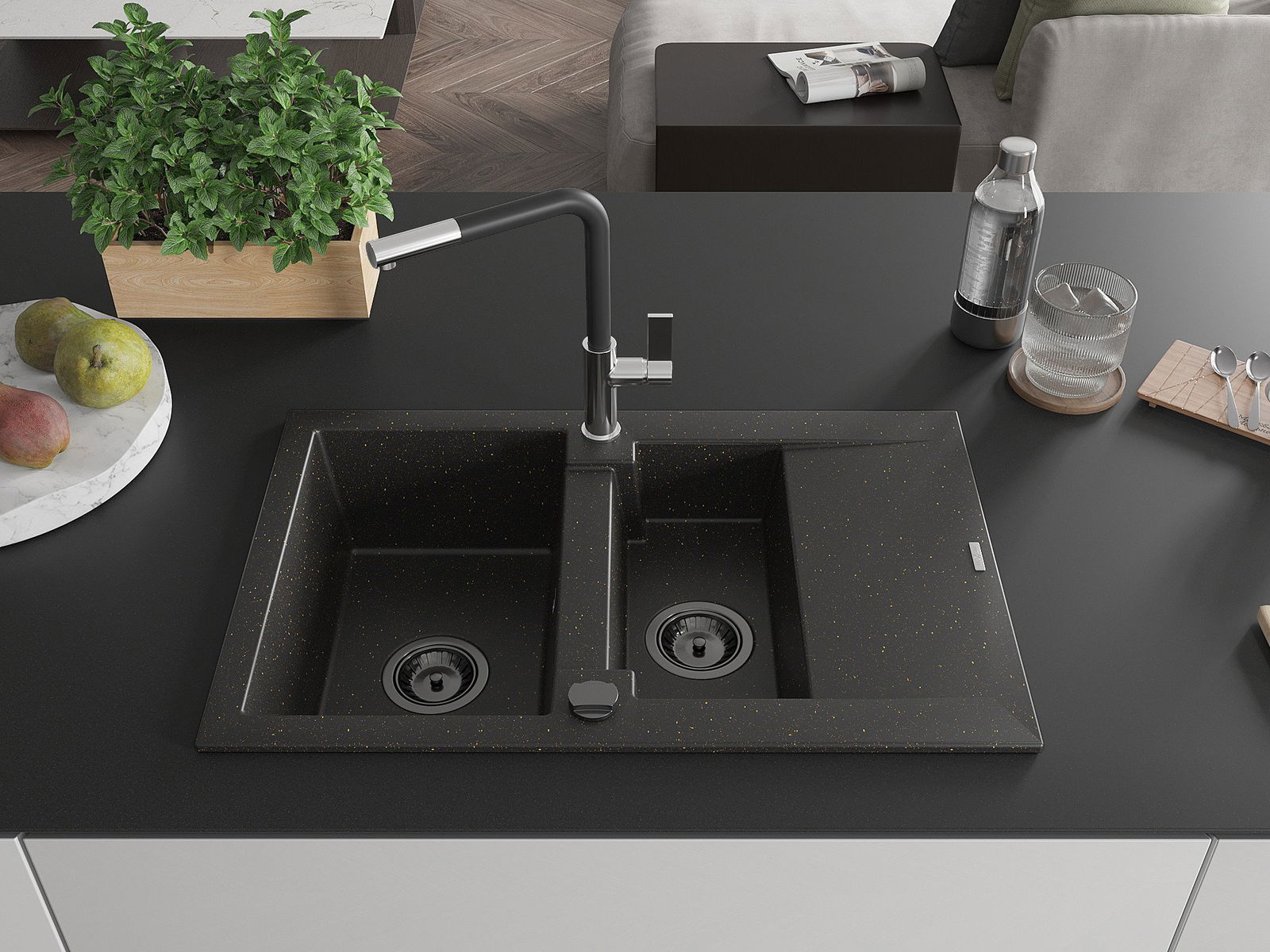 Mexen Gaspar zlewozmywak granitowy 1,5-komorowy z ociekaczem i baterią kuchenną Flora, czarny/złoty - 6507-75-670401-07-B
