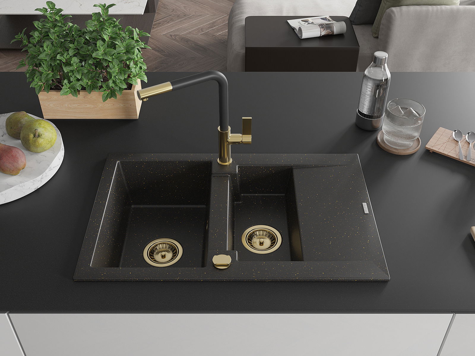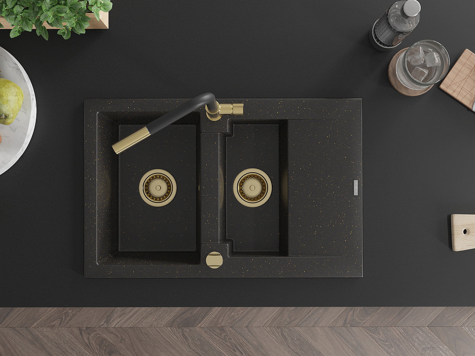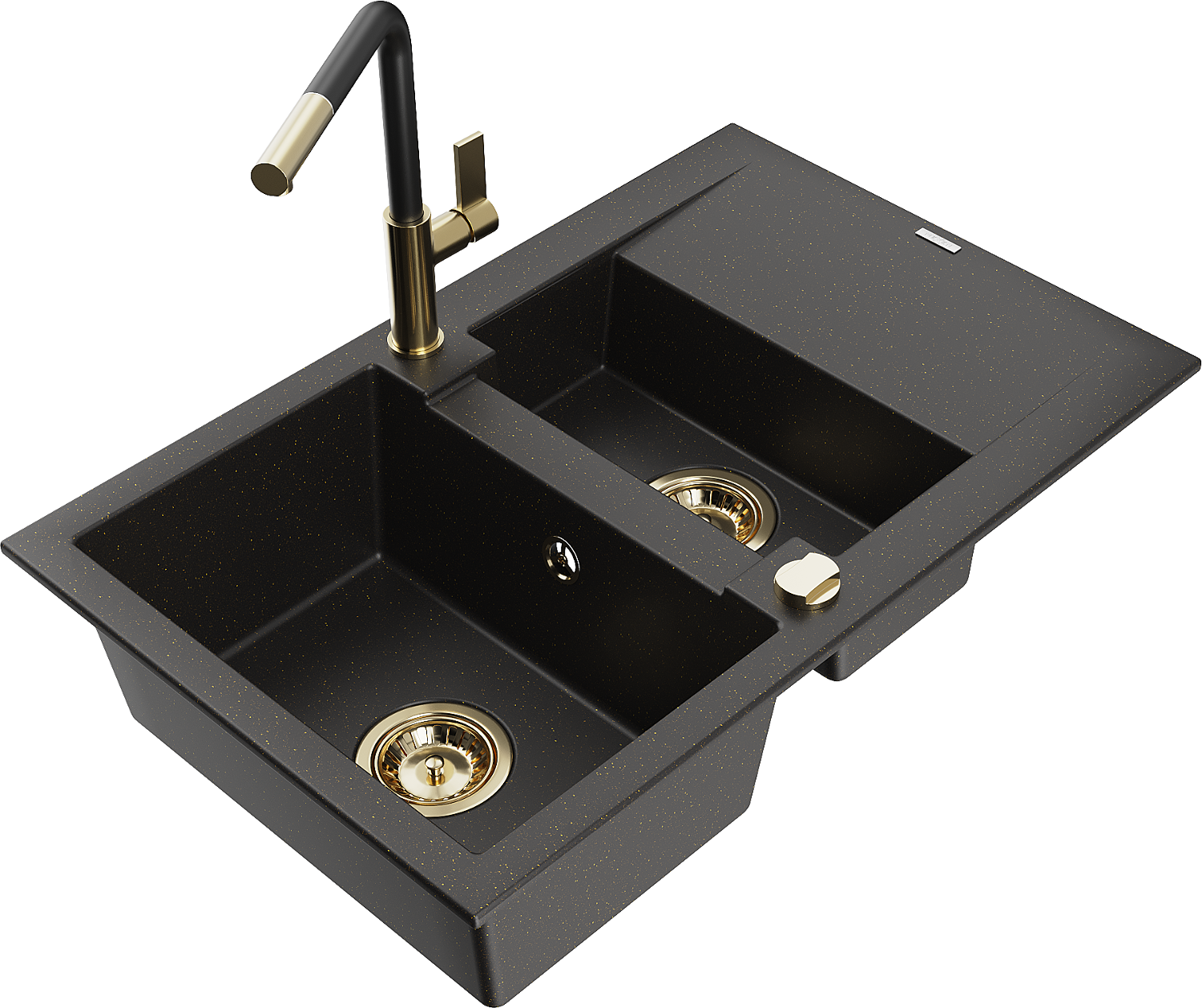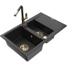 Mexen Gaspar zlewozmywak granitowy 1,5-komorowy z ociekaczem i baterią kuchenną Flora, czarny/złoty - 6507-75-670401-57-G