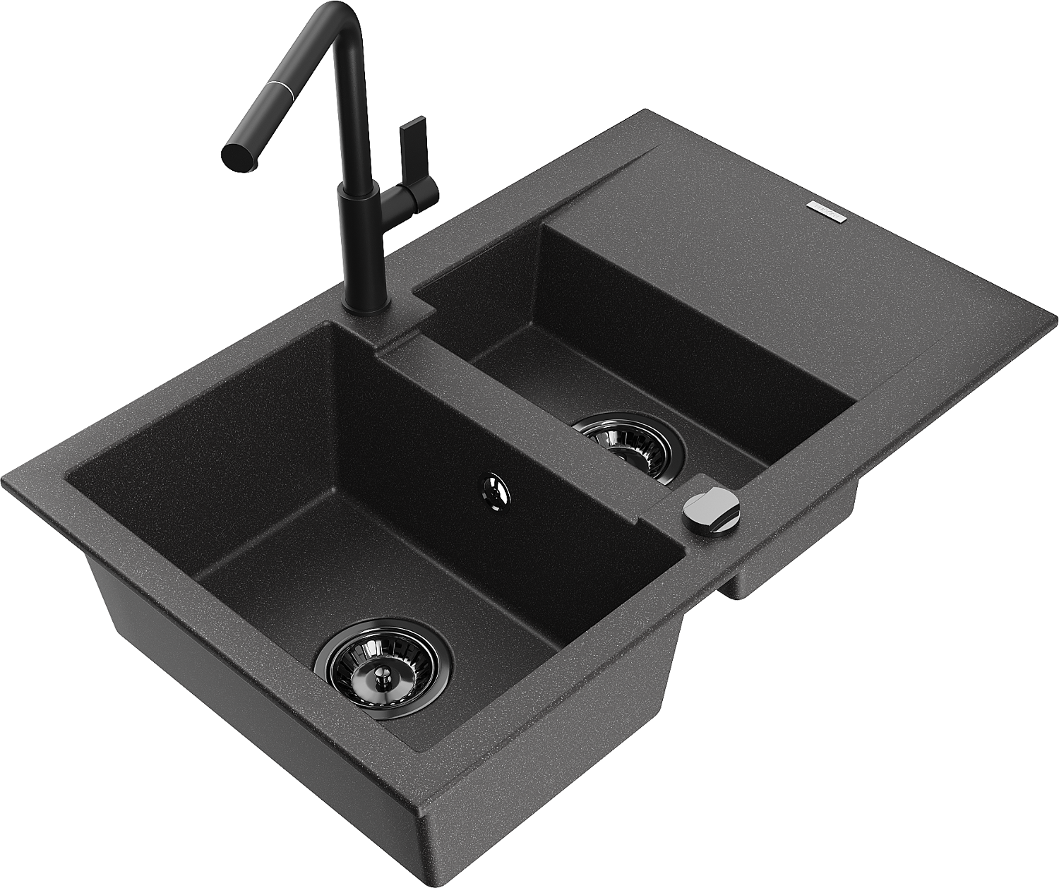 Mexen Gaspar zlewozmywak granitowy 1,5-komorowy z ociekaczem i baterią kuchenną Flora, czarny nakrapiany - 6507-76-670401-70-B