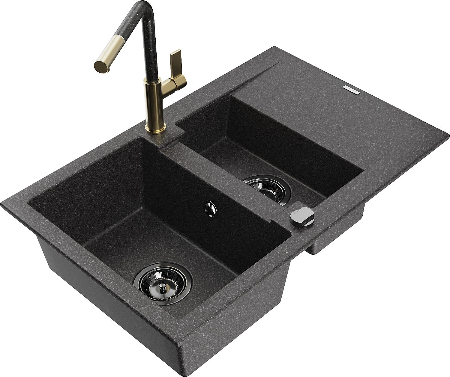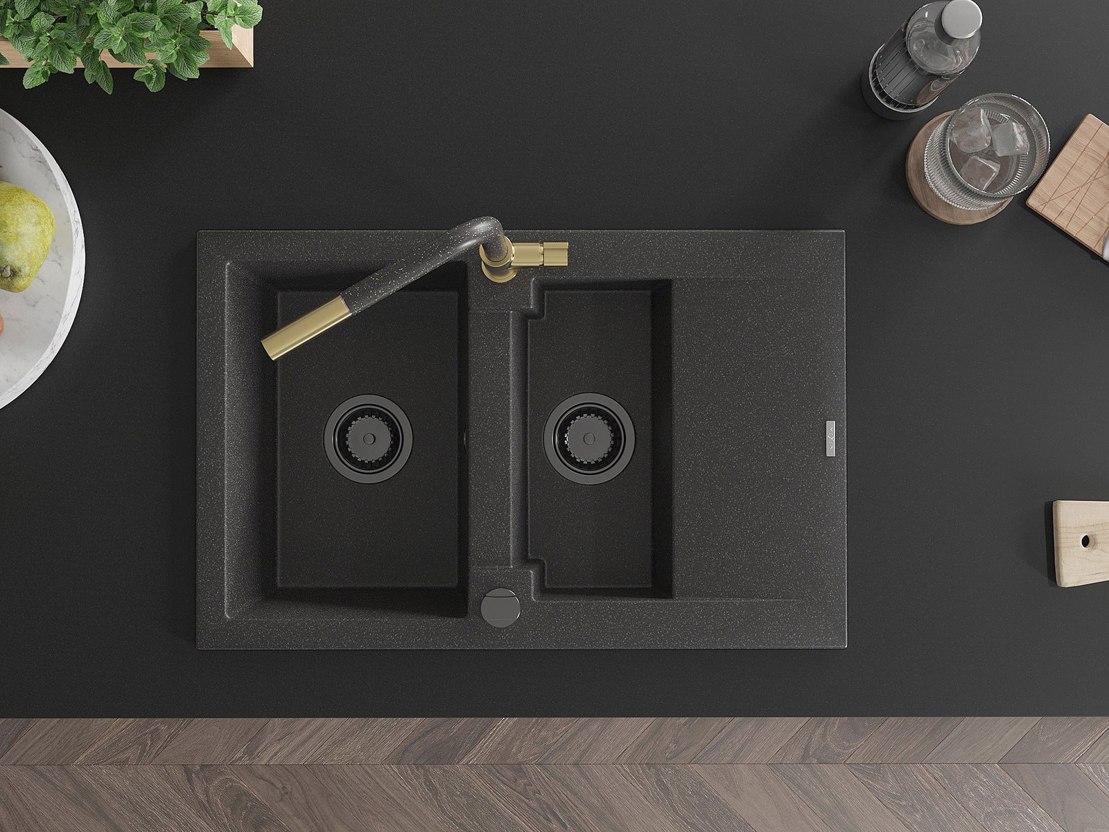 Mexen Gaspar zlewozmywak granitowy 1,5-komorowy z ociekaczem i baterią kuchenną Flora, czarny nakrapiany - 6507-76-670401-75-B