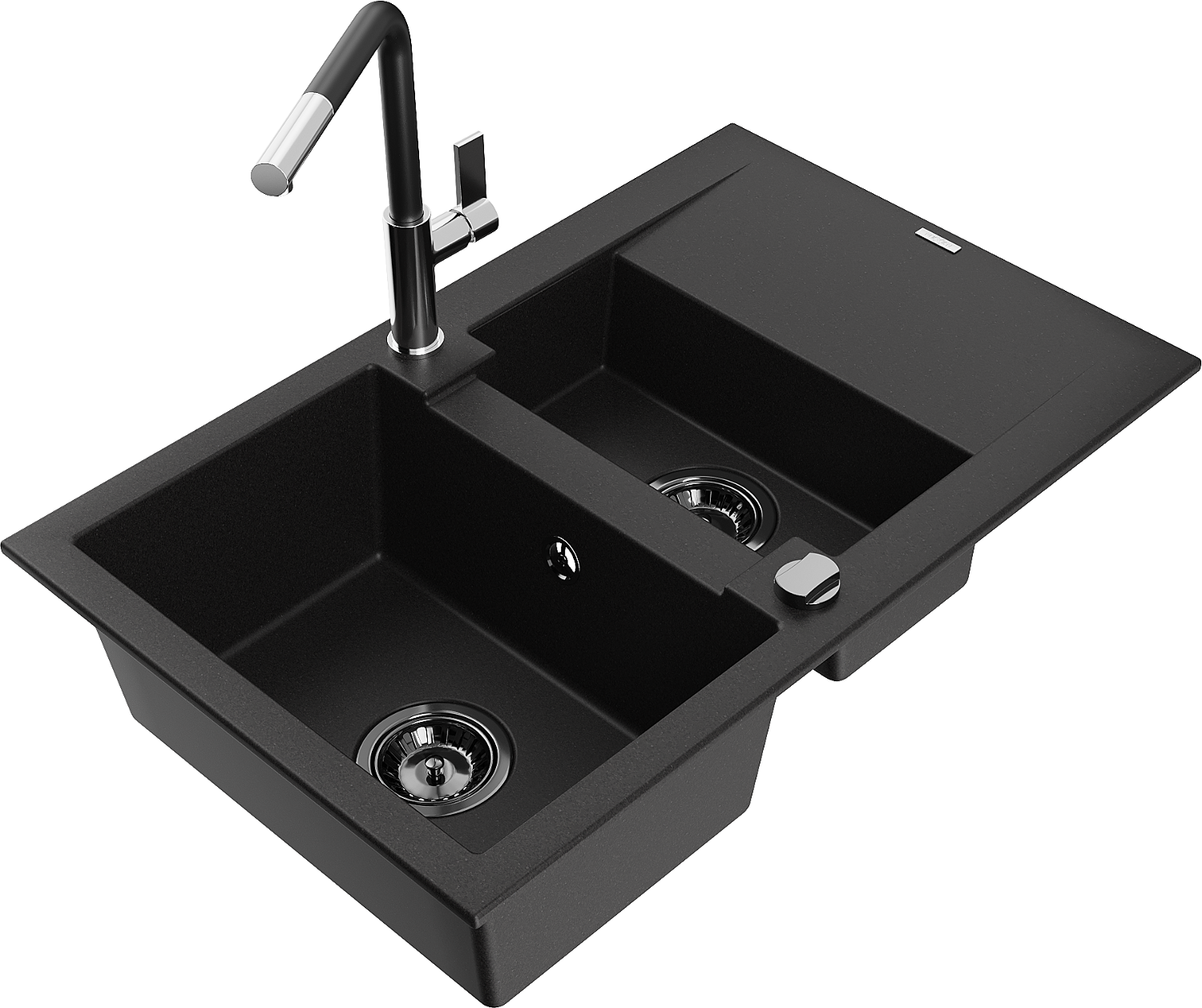 Mexen Gaspar zlewozmywak granitowy 1,5-komorowy z ociekaczem i baterią kuchenną Flora, czarny - 6507-77-670401-07-B