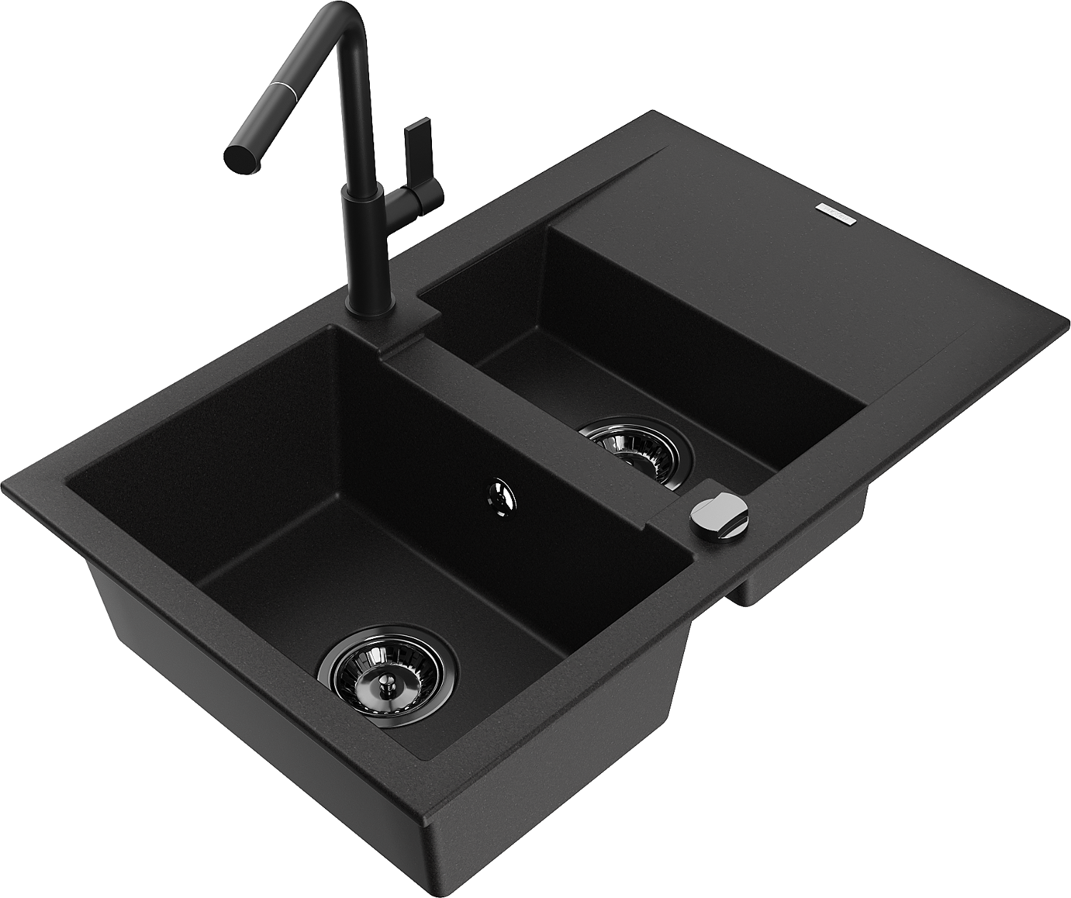 Mexen Gaspar zlewozmywak granitowy 1,5-komorowy z ociekaczem i baterią kuchenną Flora, czarny - 6507-77-670401-70-B