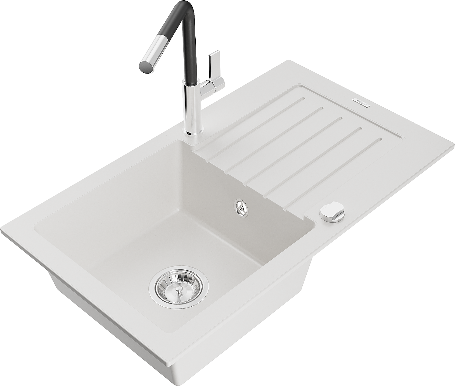 Mexen Pablo zlewozmywak granitowy 1-komorowy z ociekaczem i baterią kuchenną Flora, biały - 6510-20-670401-07