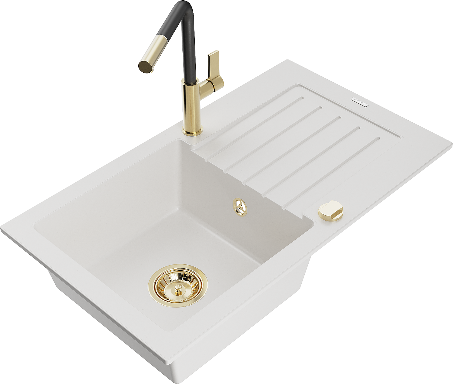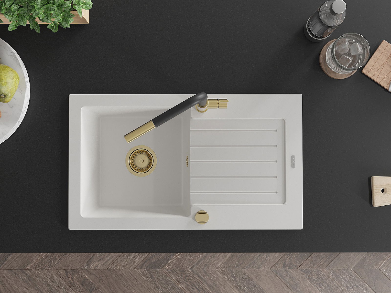 Mexen Pablo zlewozmywak granitowy 1-komorowy z ociekaczem i baterią kuchenną Flora, biały - 6510-20-670401-57-G