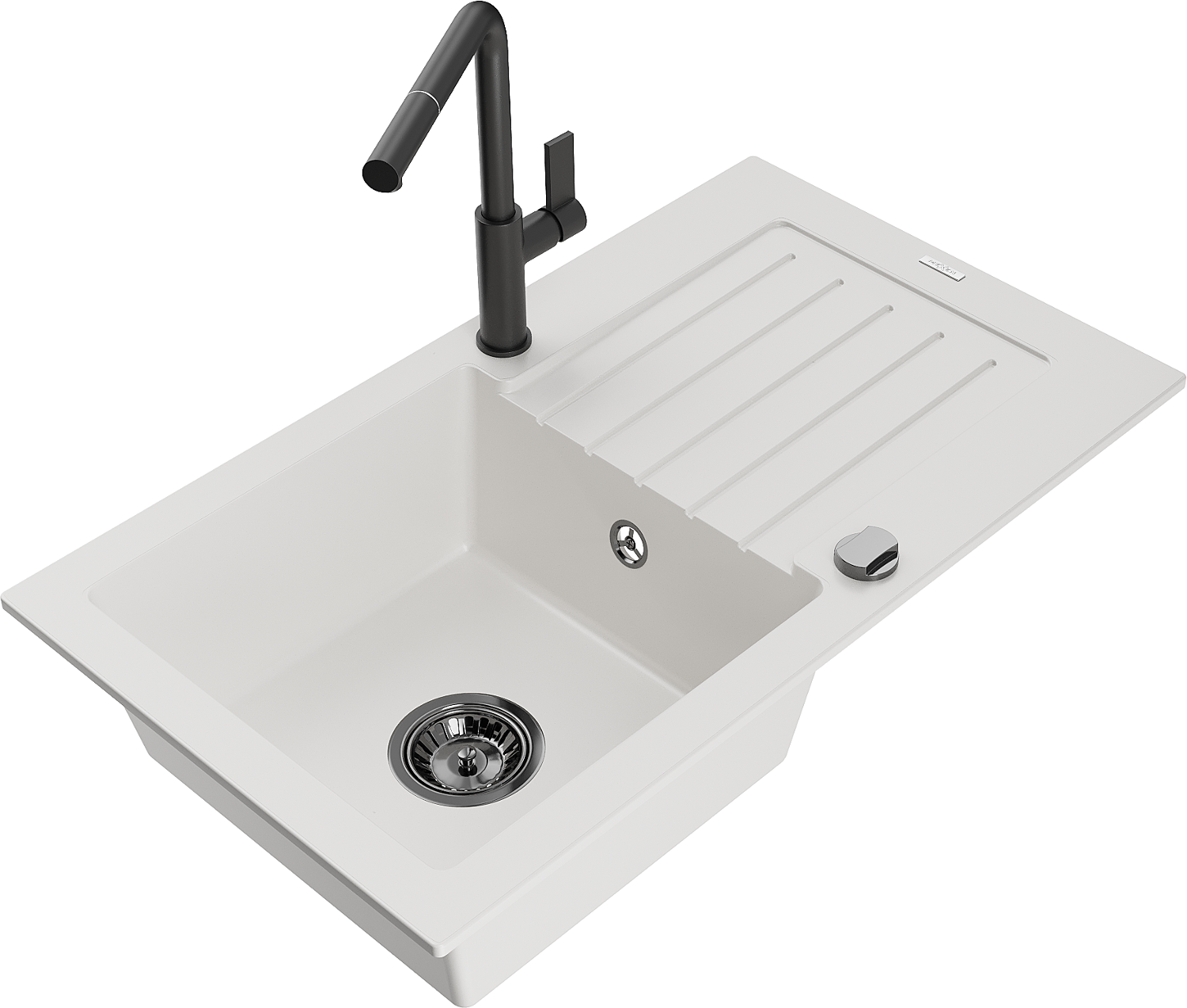 Mexen Pablo zlewozmywak granitowy 1-komorowy z ociekaczem i baterią kuchenną Flora, biały - 6510-20-670401-70-B