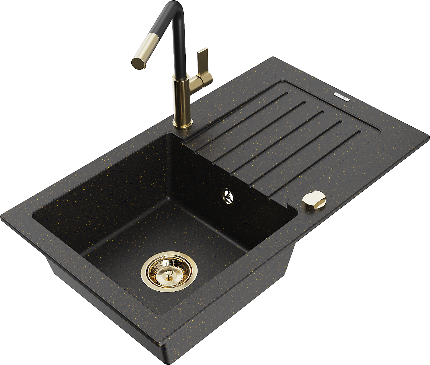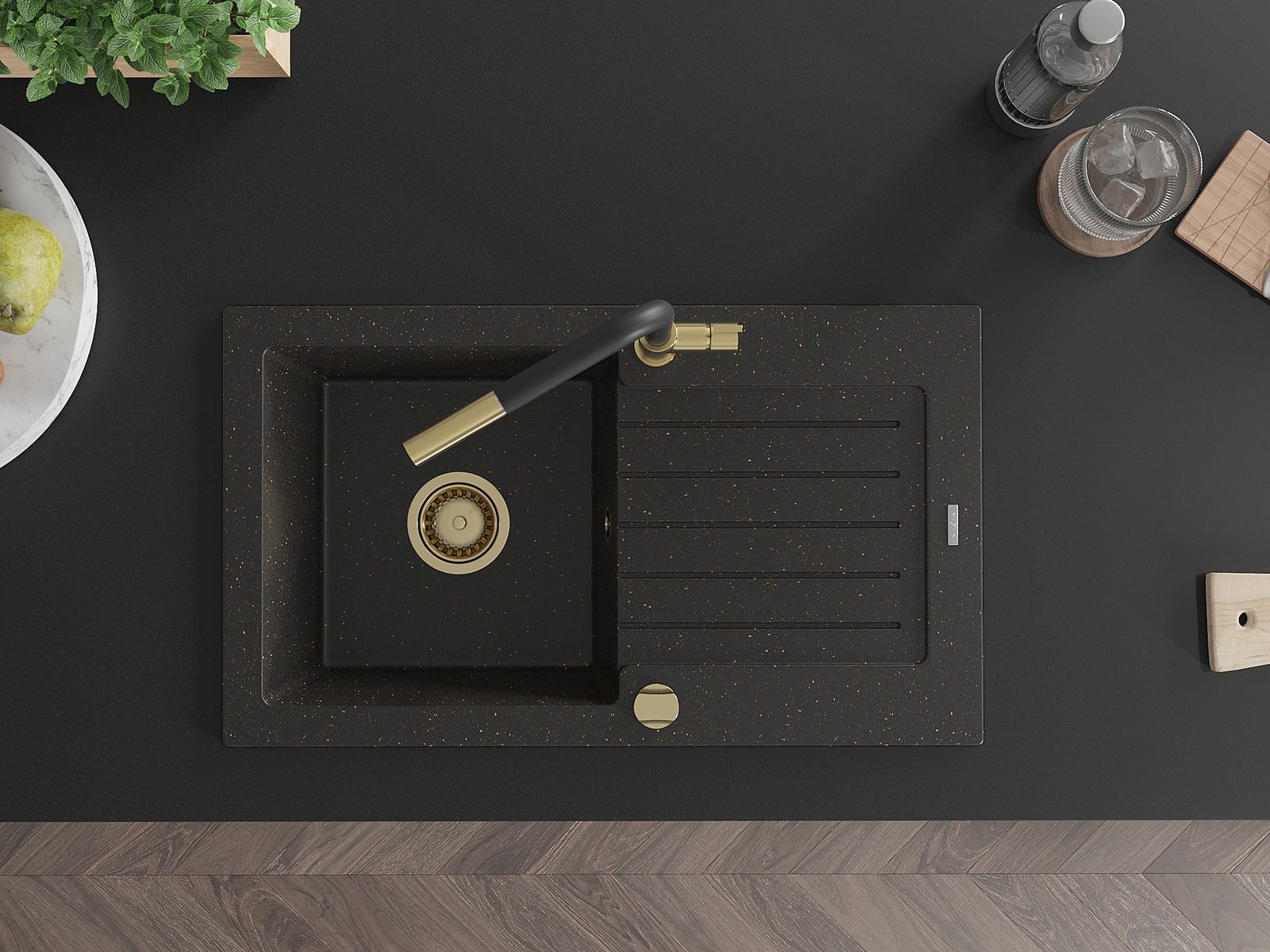 Mexen Pablo zlewozmywak granitowy 1-komorowy z ociekaczem i baterią kuchenną Flora, czarny/złoty metalik - 6510-75-670401-57-G
