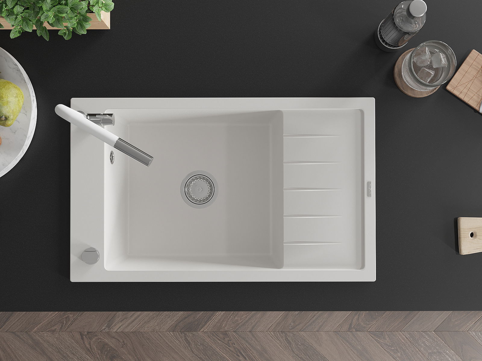 Mexen Elias zlewozmywak granitowy 1-komorowy z ociekaczem i baterią kuchenną Flora, biały - 6511-20-670401-02
