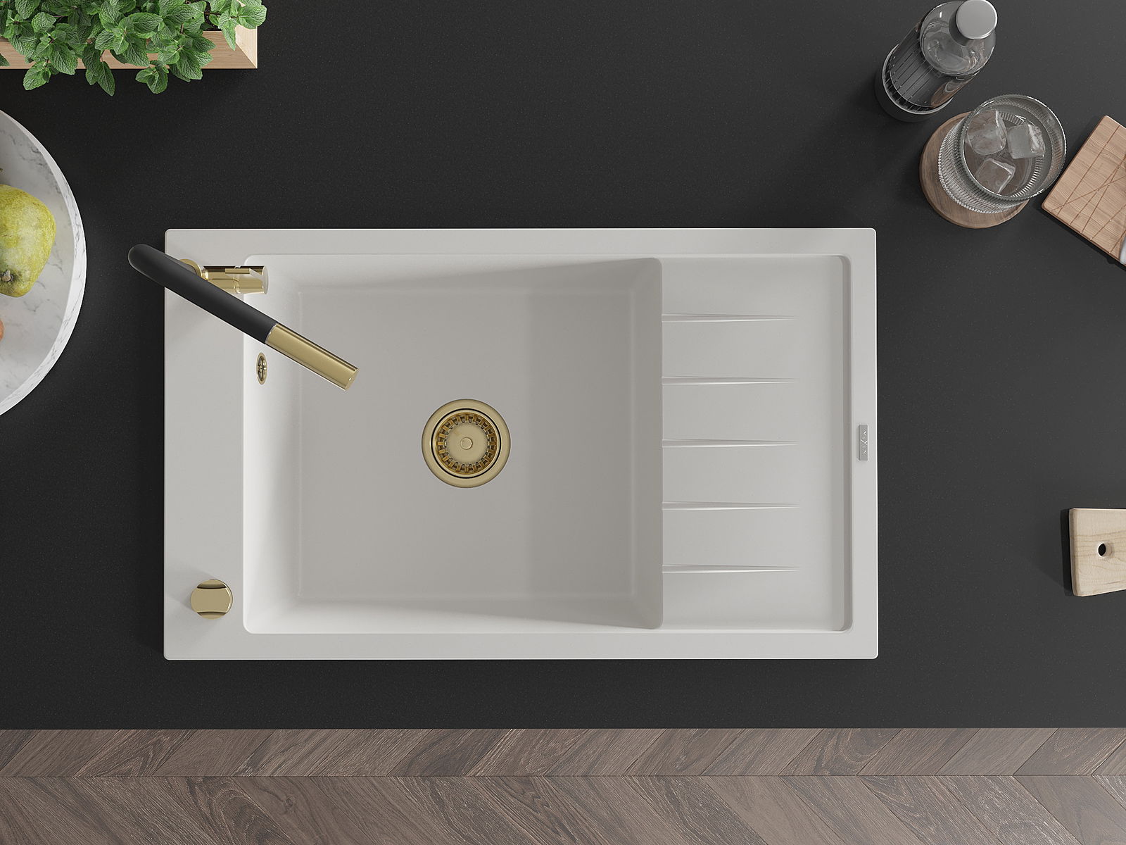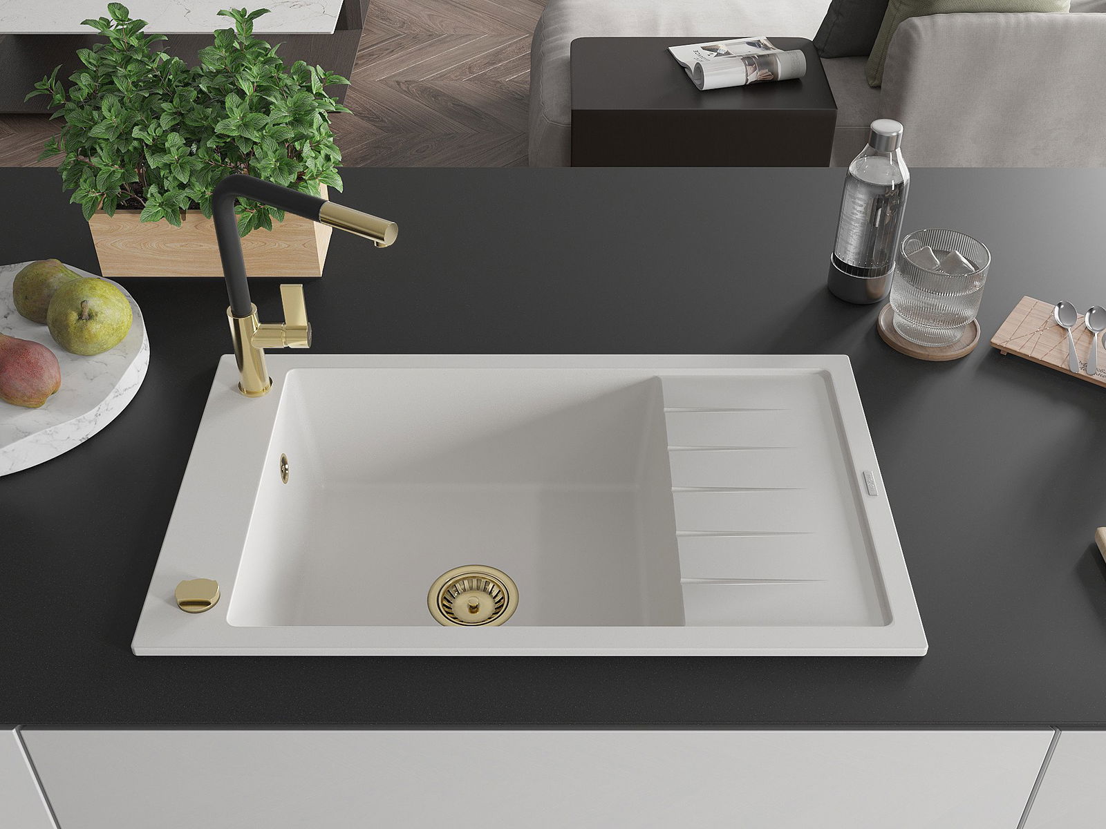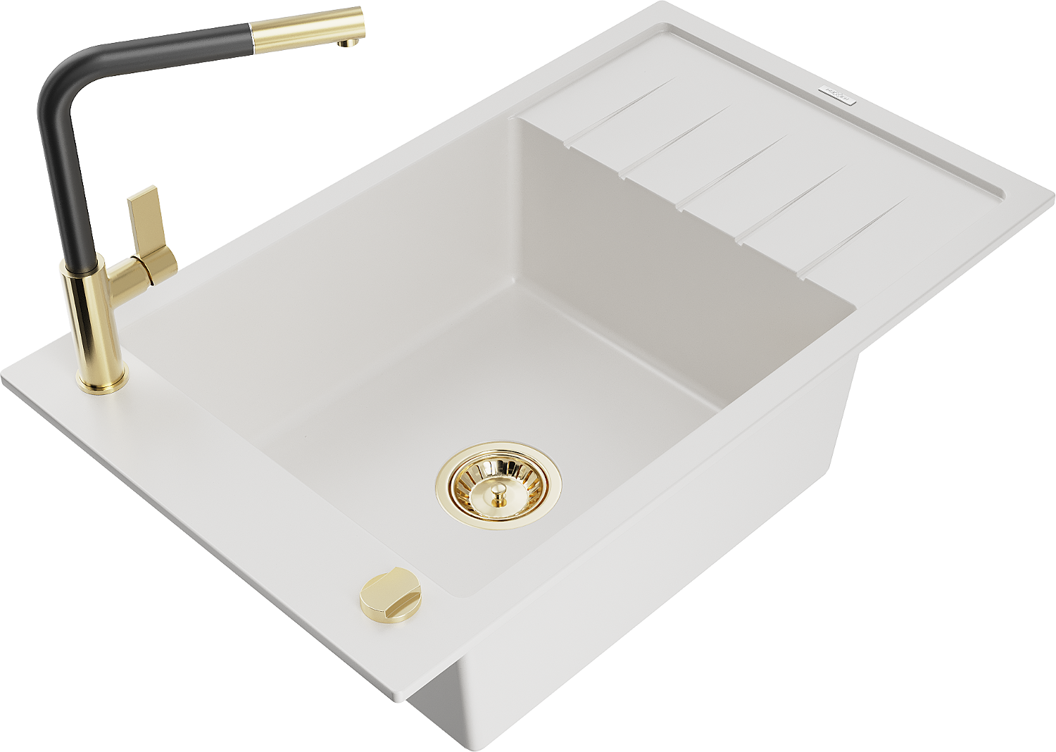Mexen Elias zlewozmywak granitowy 1-komorowy z ociekaczem i baterią kuchenną Flora, biały - 6511-20-670401-57-G